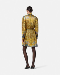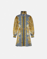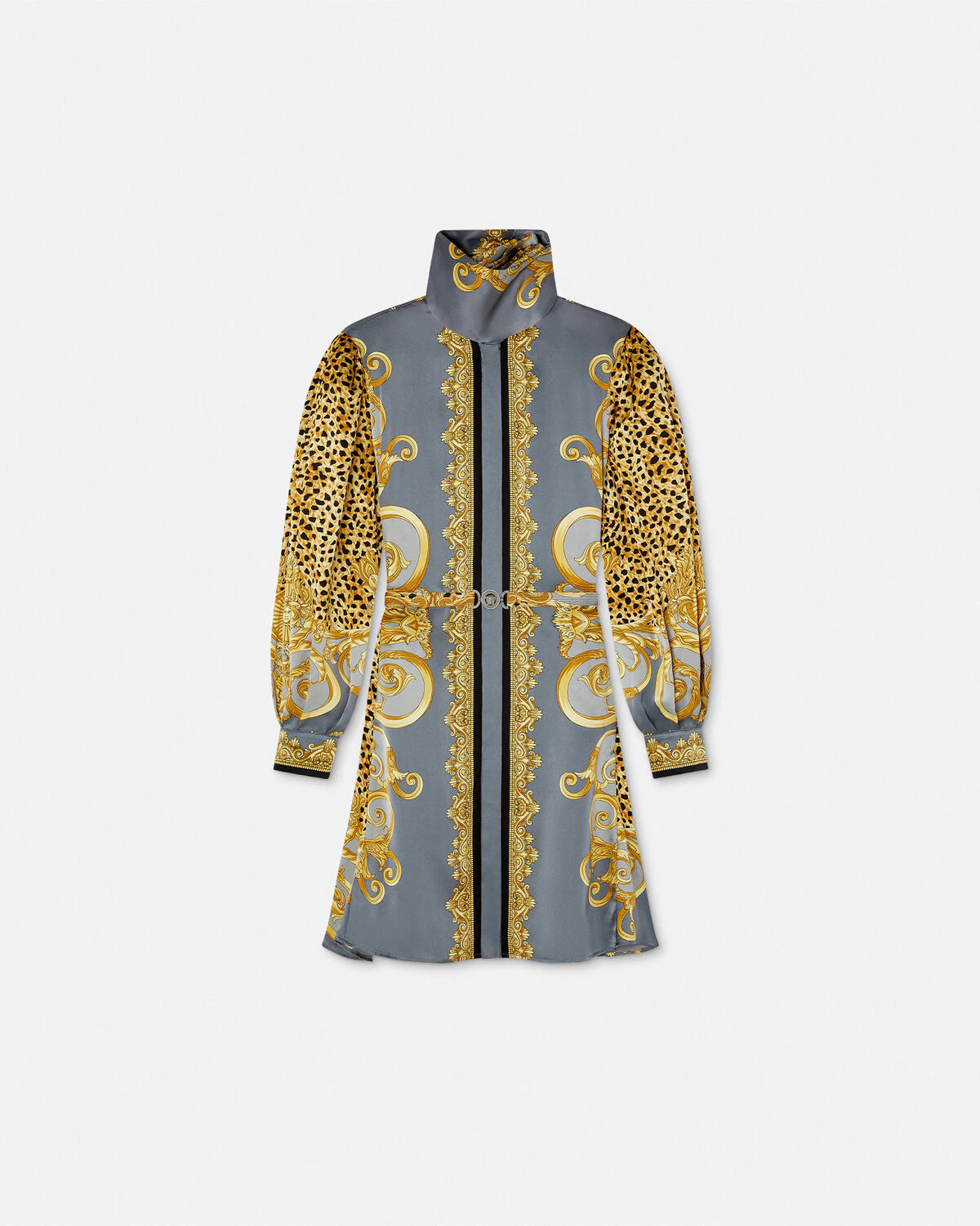 DETAILS A flared lavallire mini dress featuring an animalier print with pouf long sleeves The style is complete with a removable Medusa 95 belt at the waist - Cheetah Foulard print - Medusa '95 hardware - Long sleeves - Lavalliere collar - Concealed button placket - Detachable waist belt - Outer Composition: 100% Silk Item: 1021771-1A16262_5E700 SIZE & FIT - The model is 5'10" / 1.78 m tall and wears size 38 IT