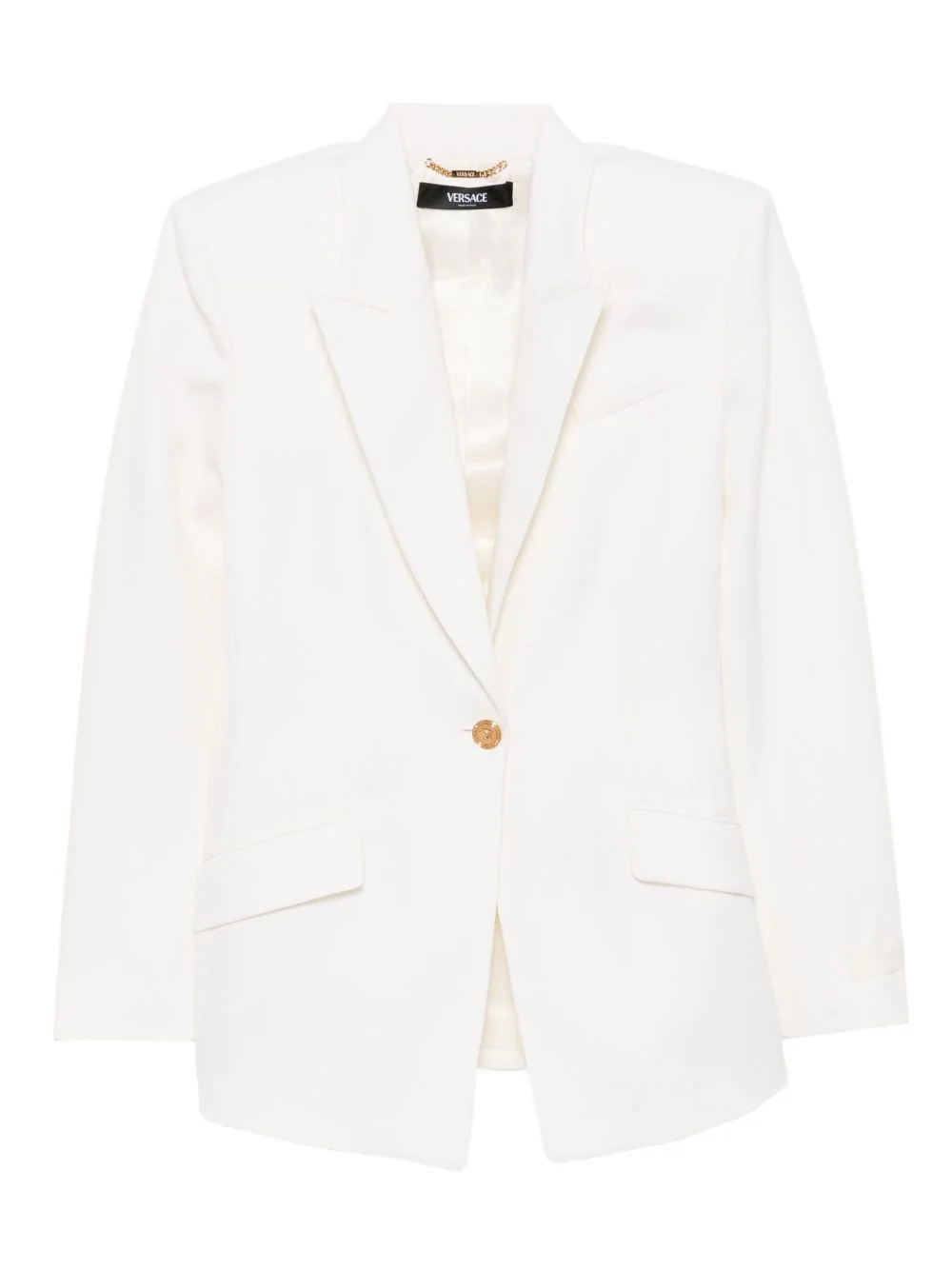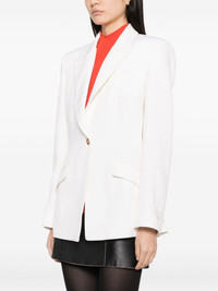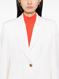 wool single-breasted blazer Highlights - Ivory white - Front button fastening - Two front flap pockets - Cuff sleeves Made in Italy Composition Lining: Cupro 100% Outer: Virgin Wool 100% SIZE & FIT Model measurements Height 5 ft 10 in(1.78 m) Bust/Chest 30.31 in(77 cm) Hips 37 in(94 cm) Waist 24.8 in(63 cm) FittingInformation Designed for a slim fit that sits just away from the body offering a close yet comfortable fit The internal shoulder pads offer a structured shape Made from a midweight non-stretch fabric