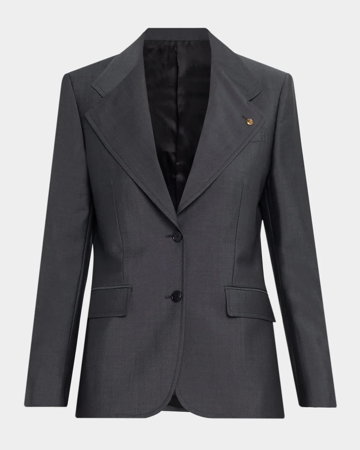 Versace wool-blend jacket accented with signature Medusa hardware Wide notch lapels Single-breasted front & nbsp; Long sleeves with button cuffs Chest welt pocket Hip flap pockets Tailored fit Back vent Button-front & nbsp; Wool/mohair Lining: Viscose Dry clean only & nbsp; Made in Italy SIZE & FITModel measurements: 5 & apos;10" tallModel is wearing a US size 4/Small