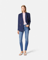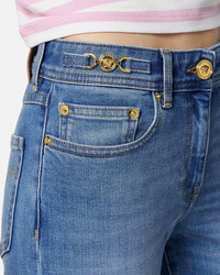 DETAILS These five-pocket denim skinny jeans in a stone-washed finish are accented by Medusa '95 hardware at the side and a leather logo patch on the back. - Medusa '95 hardware - Back logo patch - Belt loops - Front button and zip closure - Five-pocket design - Outer composition: 98% Cotton, 2% Elastane - Lining: 65% Polyester, 35% Cotton - Trim: 100% Calf leather Item: 1013135-1A10390_1D030 SIZE & FIT - The model is 5'10" tall and wears size 27 IT