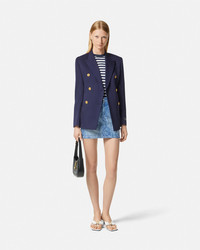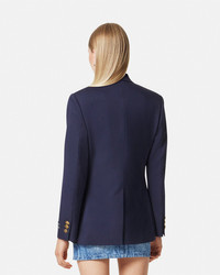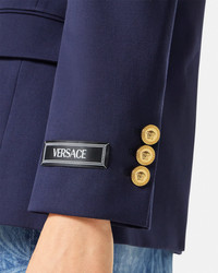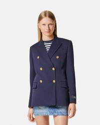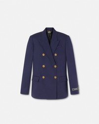 DETAILS A double-breasted blazer with a slim, masculine fit accented by Medusa buttons and a tonal tailoring label on the sleeve. The design is complete with padded shoulders, peaked lapels and a full lining in the signature Barocco motif. - Medusa hardware - Tailoring label - Barocco lining - Long sleeves - Front button closure - Peaked lapels - Side flap pockets - Chest welt pocket - Buttoned cuffs - Back single vent - Outer composition: 98% Pure virgin wool, 2% Elastane - Lining: 58% Cupro, 42% Viscose Item: 1013463-1A04649_1UI20 SIZE & FIT - The model is 5'8" tall and wears size 38 IT