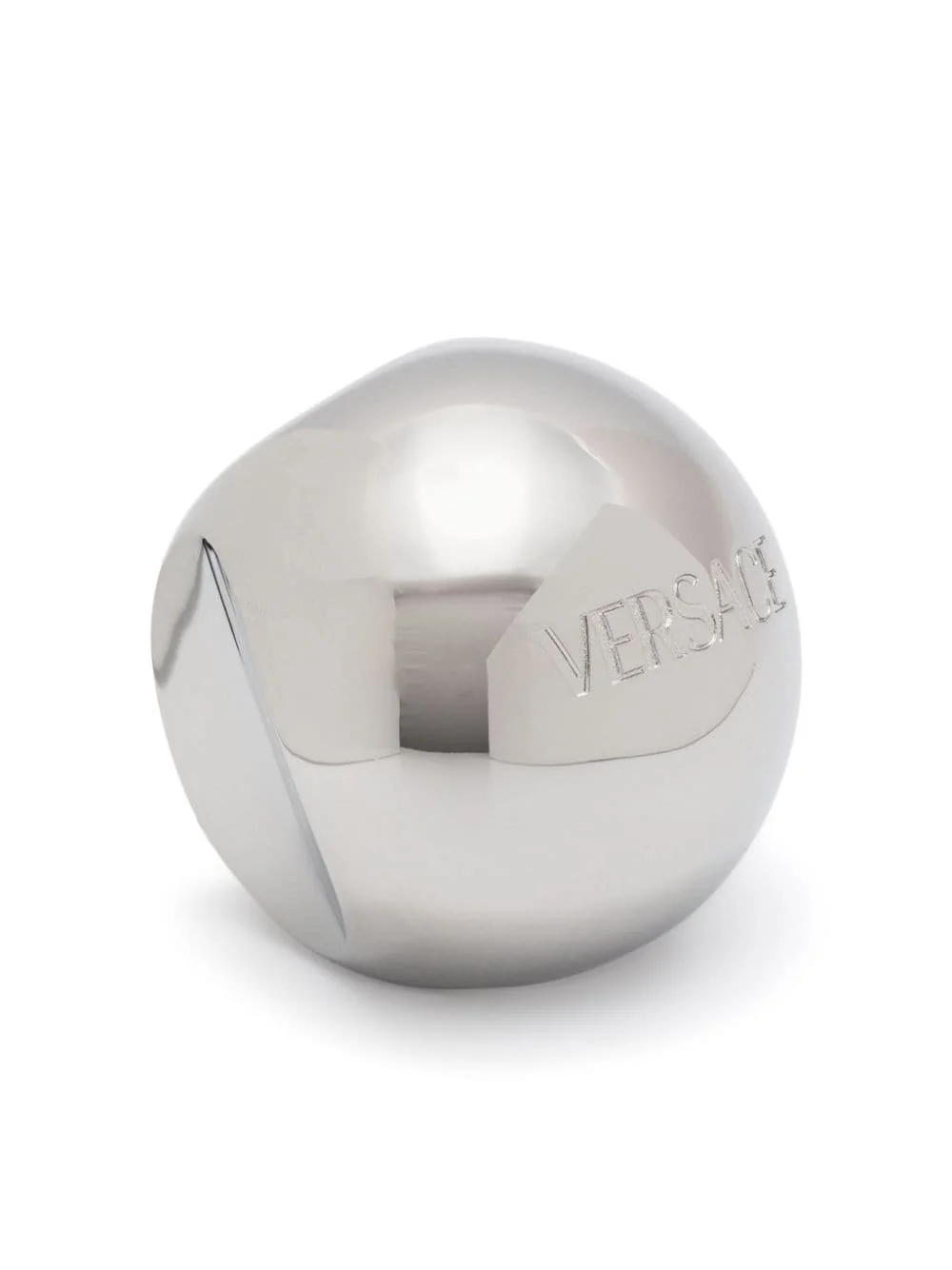 Sphere logo-engraved ring A rather maximalist approach from the Italian fashion house, Versace's Sphere ring is so-called thanks to its spherical and oversized signet band. Carefully engraved, the brand's logo lettering decorates the polished silver-tone piece. Highlights - Silver-tone - Polished finish - Signet band - Engraved logo Made in Italy SIZE & FIT Model measurements Height 5 ft 10 in(1.78 m) Bust/Chest 33.46 in(85 cm) Hips 36.22 in(92 cm) Waist 23.22 in(59 cm) Measurement Band Width 1.29 in(3.3 cm) CIRCUMFERENCE 2.24 in(5.7 cm)