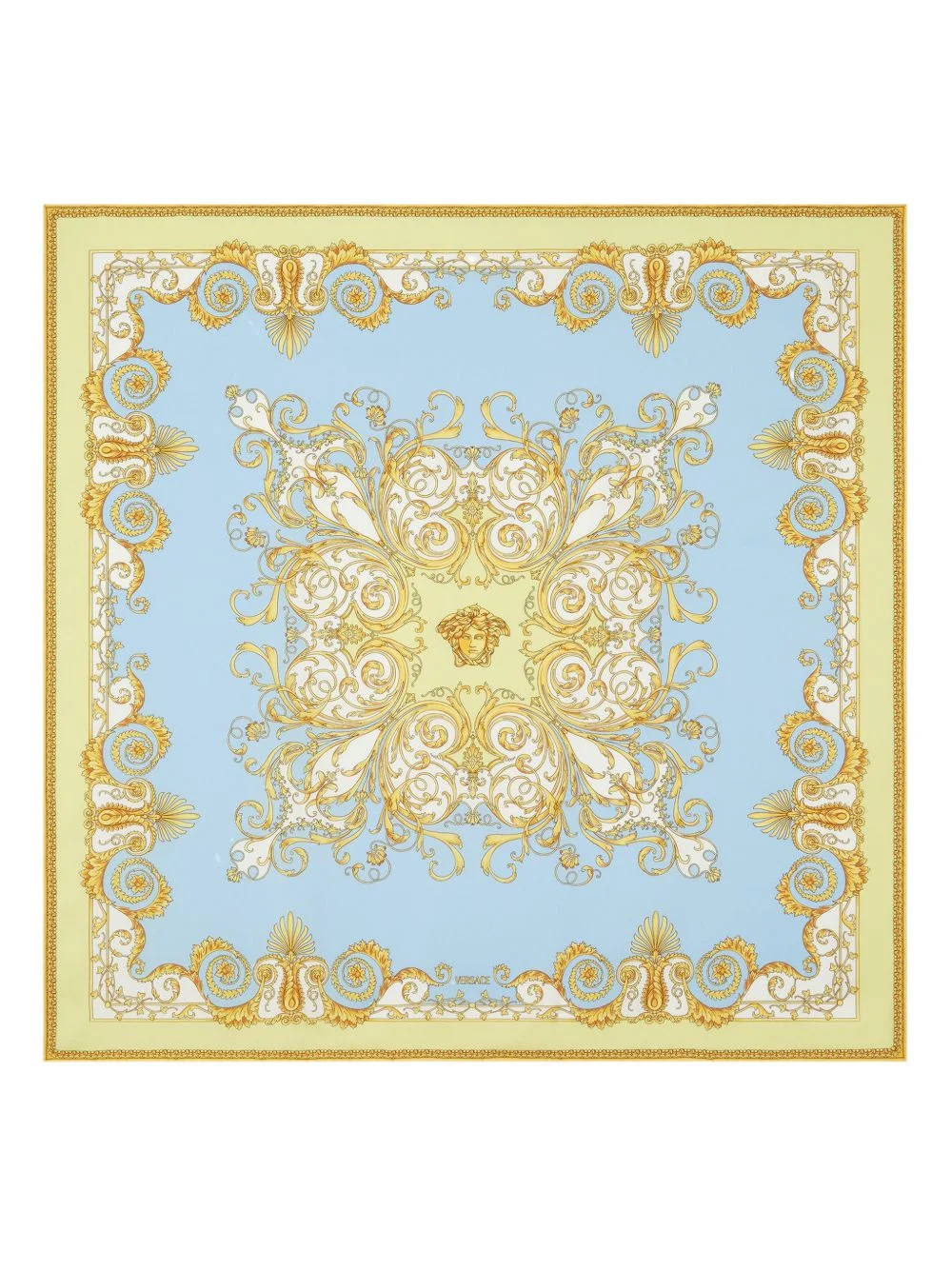 Spring Barocco printed silk scarf Highlights - Light blue and gold - Silk - Spring barocco print - Hand-rolled edges Imported Composition Silk 100% SIZE & FIT Measurement LENGTH 35.43 in(90 cm) WIDTH 35.43 in(90 cm)