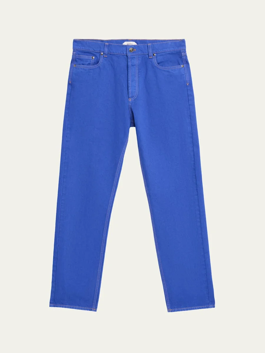 Versace straightleg jeans crafted from colored nonstretch denim Features signature 3D Medusa hardware on the back Lowrise; sits at the hip Fivepocket style Relaxed fit Ankle length Hidden button/zip fly; belt loops Cotton Hand wash or dry clean Made in Italy SIZE amp; FITModel measurements: 5'10" tall Model is wearing a US size 4/Small