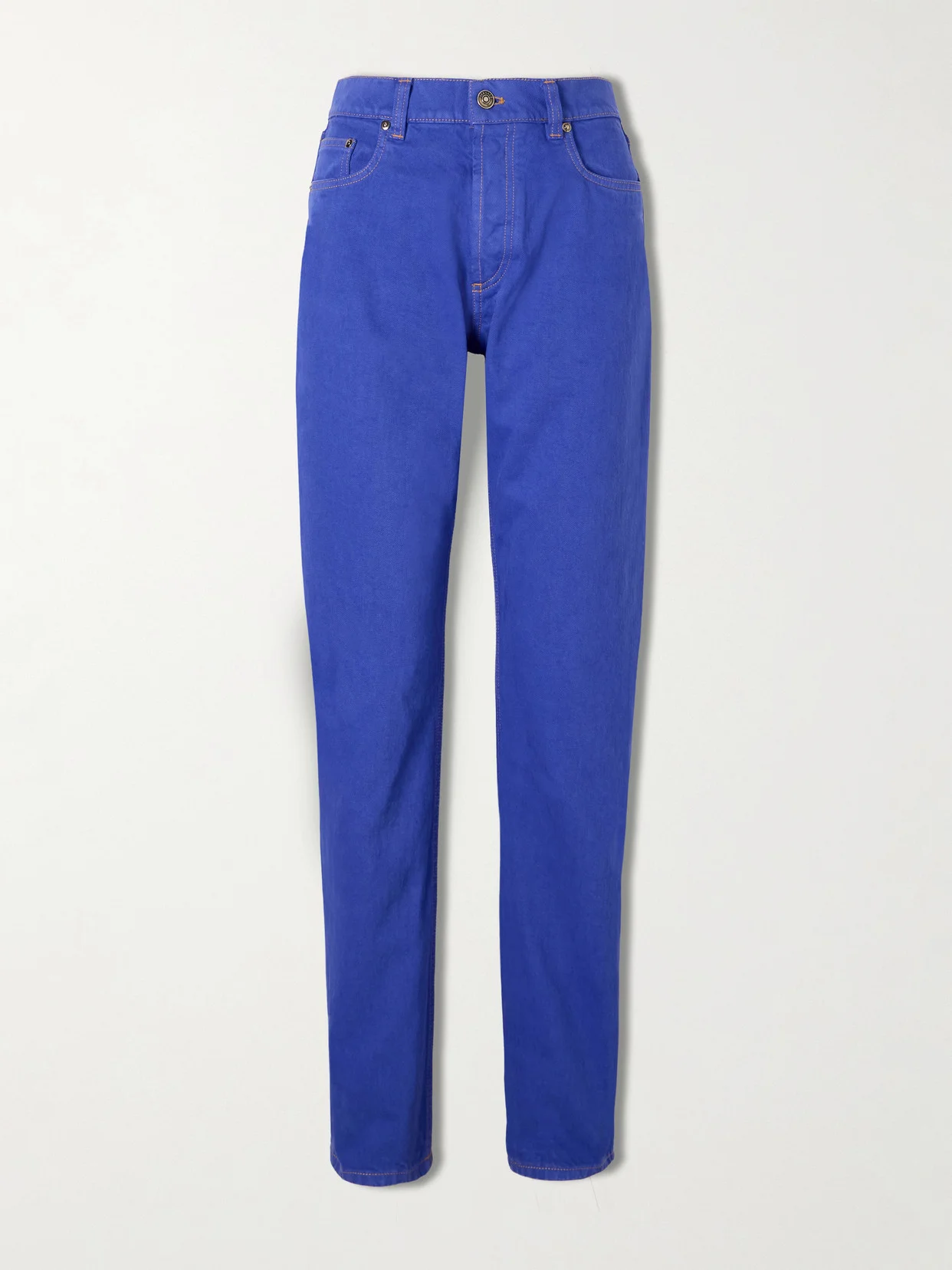 These low-rise straight-leg jeans by Versace are crafted from colored cotton denim and designed with a concealed front button closure and classic five-pocket construction. A leather patch at the back is embossed with the logo and accented by sculptural 3D 'Medusa' hardware.