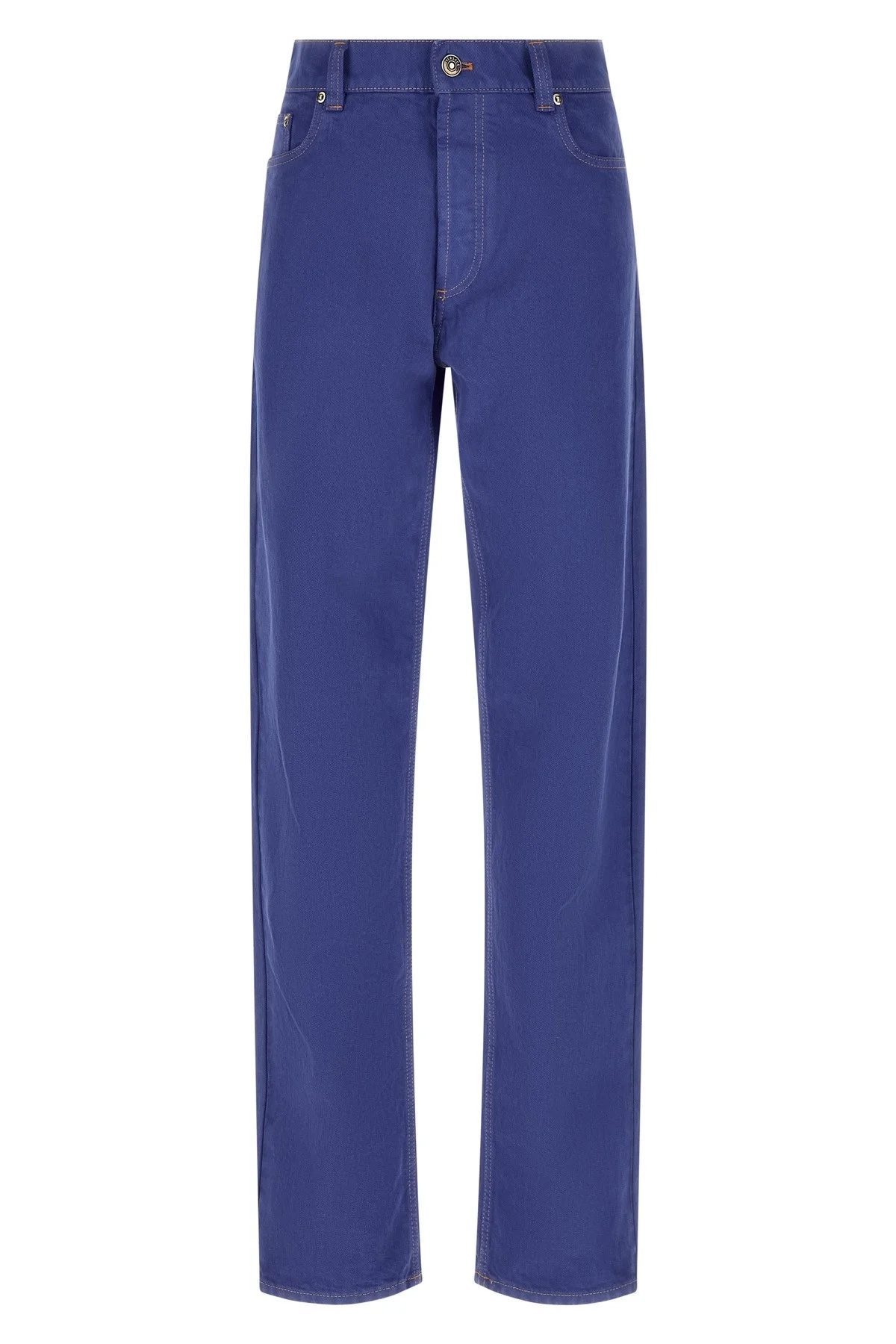 cod. 10245691A178711DB10 Garment-dyed cotton denim jeans with contrast stitching, wide and straight leg, high waist, front zip and button closure, five pockets, adjustable leg bottom with button, leather logo tag with embossed Versace Logo and a three-dimensional metal 'Medusa'. Color: Blue Size & Fit: true to size fit Composition: 100% cotton Made in: Italy