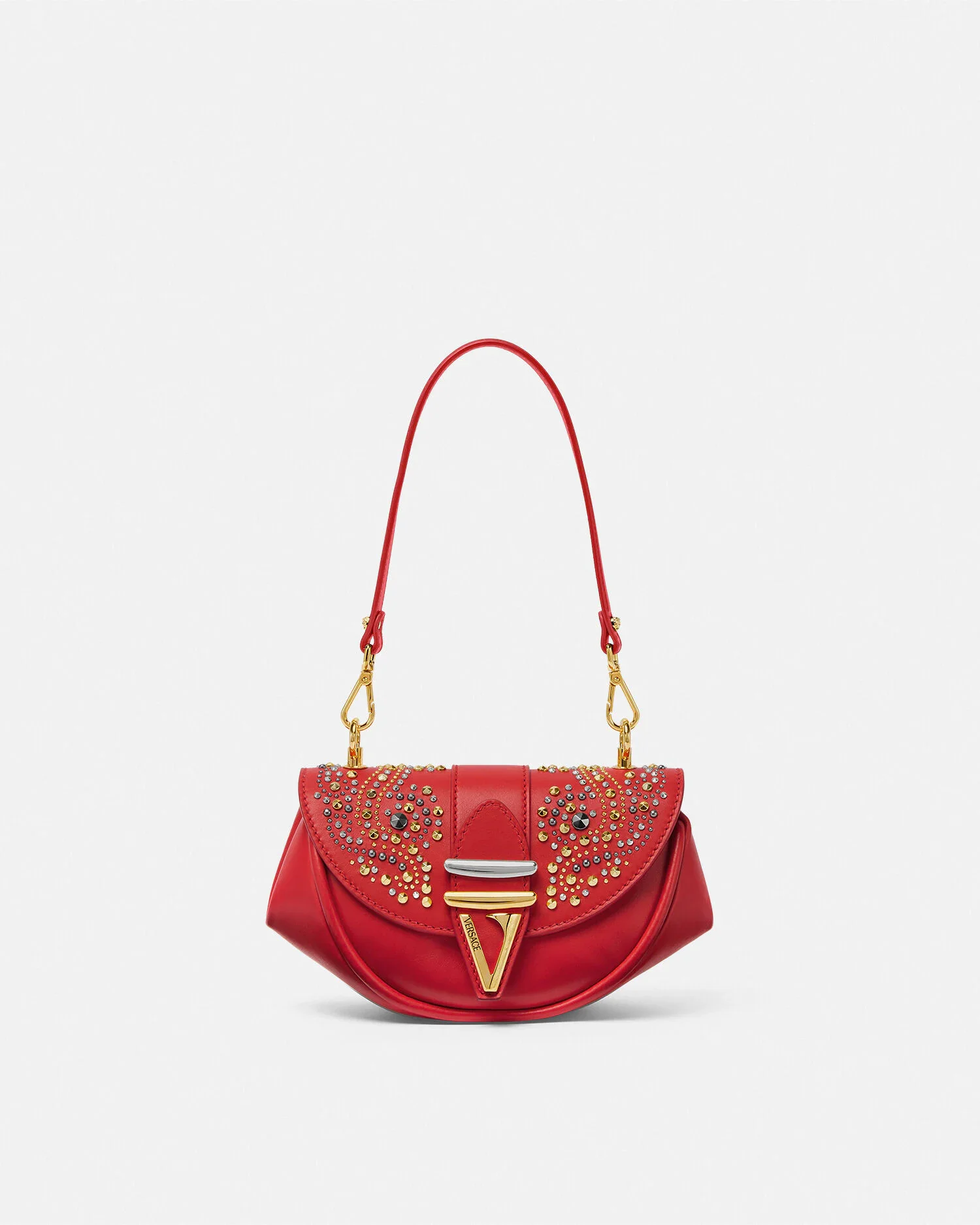The Virtus shoulder bag, a tribute to Versace's signature iconography, is shaped in a contemporary semi-circular silhouette and made from supple calf leather. The foldover flap is adorned with stud embellishments, a striking 'V' emblem, and an enamel-engraved Versace Logo. The detachable top handle is further embellished with Medusa stud accents. The small shoulder style is complete with an additional detachable and adjustable shoulder strap for optional crossbody wear. - V hardware - Versace Logo engraving - Stud embellishments - Detachable top handle - Foldover flap with magnetic closure - Interior slip pocket - Detachable and adjustable shoulder strap - Outer Composition: 100% Calf Leather - Lining: 100% Cotton Size & Fit - L10.4 x W4.9 x H5.9" / L26.5 x W12.5 x H15 cm - Handle drop: 9.6" / 24.5 cm - Shoulder strap drop: 21.7-22.6" / 55-57.5 cm - Approximate weight: 17.7 oz / 0.5 kg Item: 1020089-1A16216_DTU_UNICA_1RD2O__
