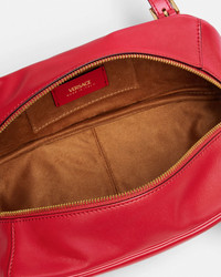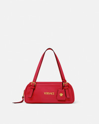 The Versace Tag bowling shoulder bag is crafted from ultra-soft nappa leather. The versatile accessory is accented by metal Versace lettering and can easily be carried over the shoulder or in-hand by the adjustable leather handles. A removable leather tag keychain with Medusa hardware completes the design. - Medusa hardware - Versace Logo lettering - Top zip closure - Adjustable top handles - Interior slip pocket - Removable keychain tag - Outer composition: 100% Lambskin - Lining: 100% Polyester Size & Fit - L10.6" x W3.9" x H4.7" / L27 x W10 x H12 cm - Handle drop: 9.8" / 25 cm - Approximate weight: 14 oz / 0.4 kg Item: 1015792-1A13171_DTU_UNICA_1RD2V__