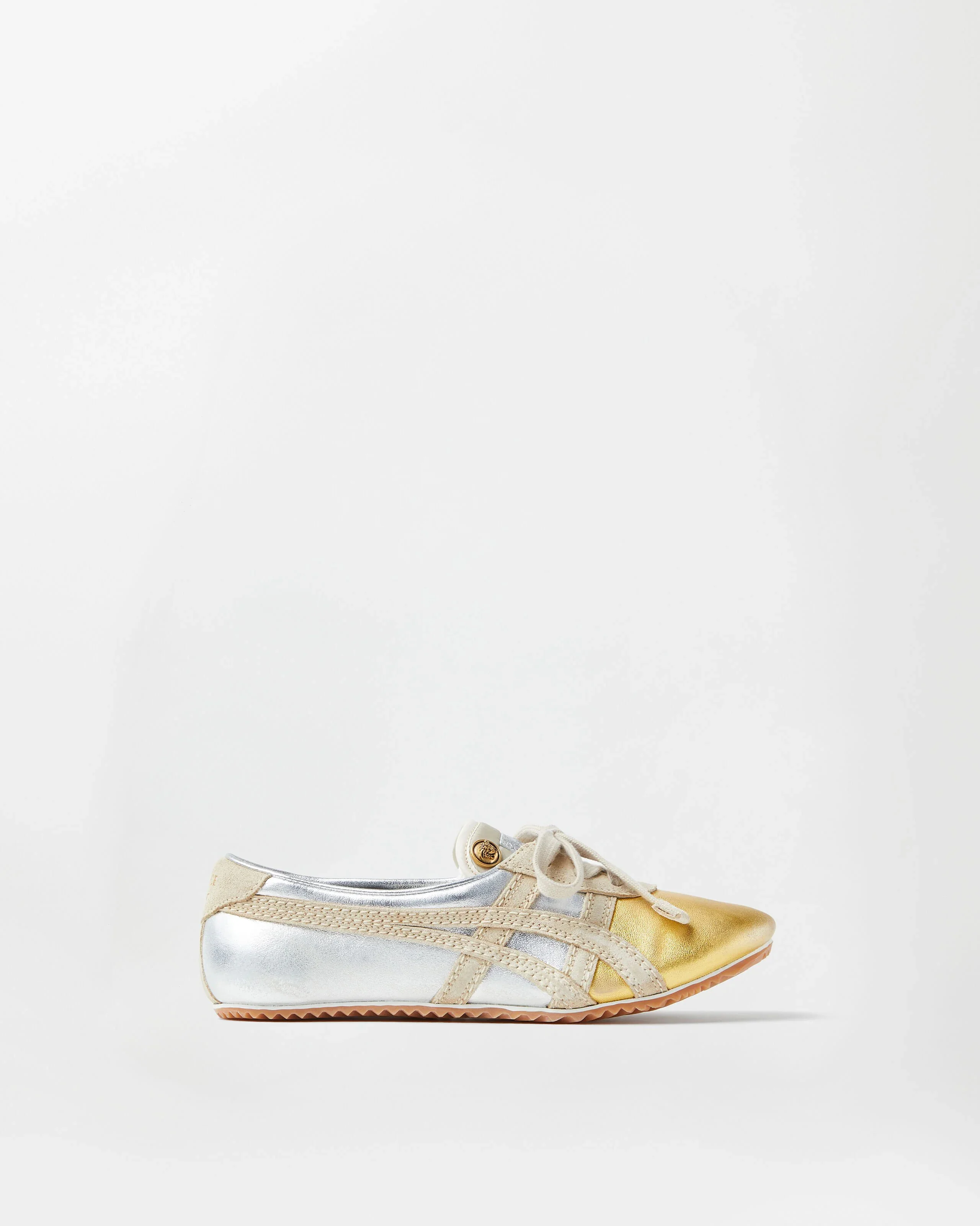 These iconic TAI-CHI Sakura sneakers are part of the Spring Summer 2026 collaboration with Onitsuka Tiger, representing a special fusion of Italian and Japanese craftsmanship. The pair is made from metallic laminated nappa leather at the Onitsuka Tiger factory in Sanin Tottori, where the upper is treated with a washing process to achieve an aged effect. They feature double stitching on the Onitsuka Tiger stripes and a Medusa hardware as a studded embellishment on the tongue. This product has undergone a special artisanal washing process. Any variations in color, shading, or slight imperfections should not be considered defects, but rather inherent characteristics of the craftsmanship that make each pair unique and one of a kind. - Medusa hardware - Versace Logo embossing on heel counter - Onitsuka Tiger embossed patch on tongue - Lace up - Round toe - Onitsuka Tiger x Versace dustbag and shoebox - Each pair is unique due to its artisanal quality and may vary slightly from the image shown - Outer composition: 100% Lambskin - Lining: 100% Cotton - Trim 1: 100% Lambskin - Trim 2: 100% Calf leather - Sole: 100% Rubber Size & Fit - Fit is small, we recommend taking half a size up - Footbed: Slim Item: 1025116-1A17738_6XD0J