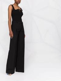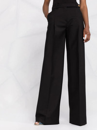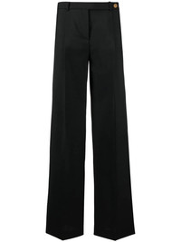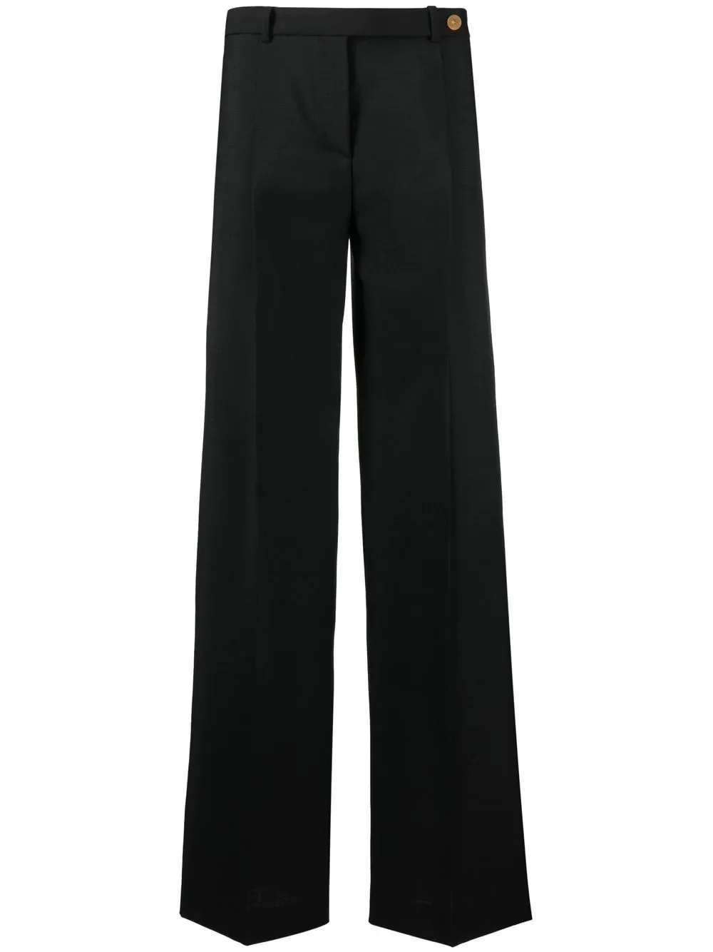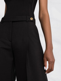tailored wide-leg trousers Departing momentarily from their signature decadent approach style, Versace presents this virgin wool-mohair blend trousers in black for their AW22 collection. A subtle nod to the brand's heritage is added with a Medusa embossed button fastening towards the side. Made in Italy Composition Outer: Mohair 60%, Virgin Wool 40% Lining: Cupro 100% SIZE & FIT Model measurements Height 5 ft 11 in(1.8 m) Bust/Chest 31.49 in(80 cm) Hips 36.61 in(93 cm) Waist 24.4 in(62 cm) FittingInformation This piece fits true to size. We recommend you get your regular size Designed to be fitted at the waist and hips, loose over the leg Made with a mid-weight non-stretch fabric Washing instructions Dry Clean Only