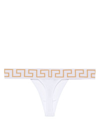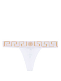 white stretch organic cotton lightweight jersey elasticated logo waistband Medusa Head motif signature Greca detailing thong style Conscious: This product contains organic cotton where the cultivation and manufacturing process restricts the use of chemicals, eliminates pesticides or artificial fertilisers and incorporates methods that respect biodiversity, improve soil quality, and reduce water consumption. Learn more about what makes a product Conscious on our Conscious Criteria page Size & Fit Model Measurements: Bust: 0cm Height: 0cm Hips: 0cm Waist: 0cm Fabric and Care Designer Style ID: AUD010421A10011 Designer Colour: A1001 BIANCO OTTICO Composition: Elastane 6%, Organic cotton 94% Washing instructions: Hand Wash Made in Bosnia and Herzegovina
