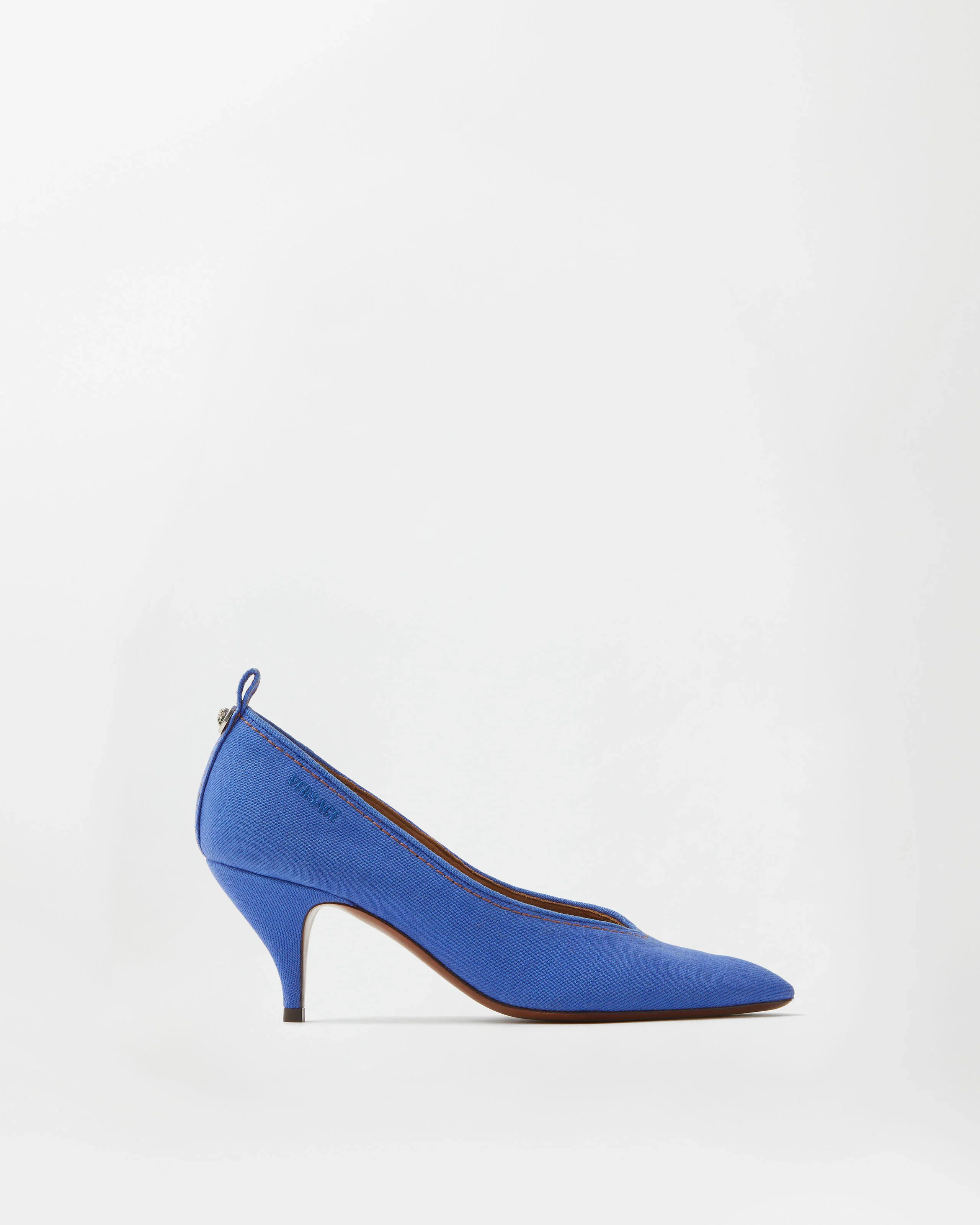 These Tina pumps are crafted from cotton denim featuring top-stitched detailing, a deep vamp and a thread-embroidered Versace Logo at the sides. Heels are decorated with a bejeweled ring featuring 3D Medusa hardware. - Medusa hardware - Versace Logo embroidery - Back pull tab - Pointed toe - Stiletto heels - Outer composition: 100% Cotton - Lining: 100% Goat leather - Sole: 100% Calf leather Size & Fit - Heel: 2.6" / 6.5 cm - Fit is true to size, we recommend taking your normal size - Footbed: Comfortable Item: 1024439-1A17710_1DB1K
