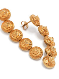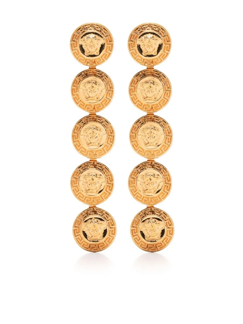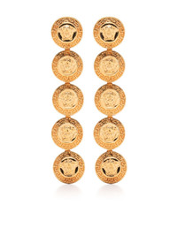 Tribute Medusa drop earrings Designed in Italy for an opulent polished look, these earrings from Versace are adorned with Tribute Medusa medallions that honour the maison's penchant for the Grecian motifs. Highlights - Gold-tone - Metal - Polished finish - Drop design - Tribute medusa medallion charms - Post-back fastening - For pierced ears - These earrings come as a pair. Made in Italy SIZE & FIT Model measurements Height 5 ft 11 in(1.8 m) Bust/Chest 32.67 in(83 cm) Hips 36.22 in(92 cm) Waist 24.4 in(62 cm) Measurement HEIGHT 2.16 in(5.5 cm) Weight (single earring) 12 g(12 g) WIDTH 0.39 in(1 cm)
