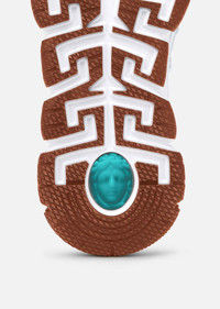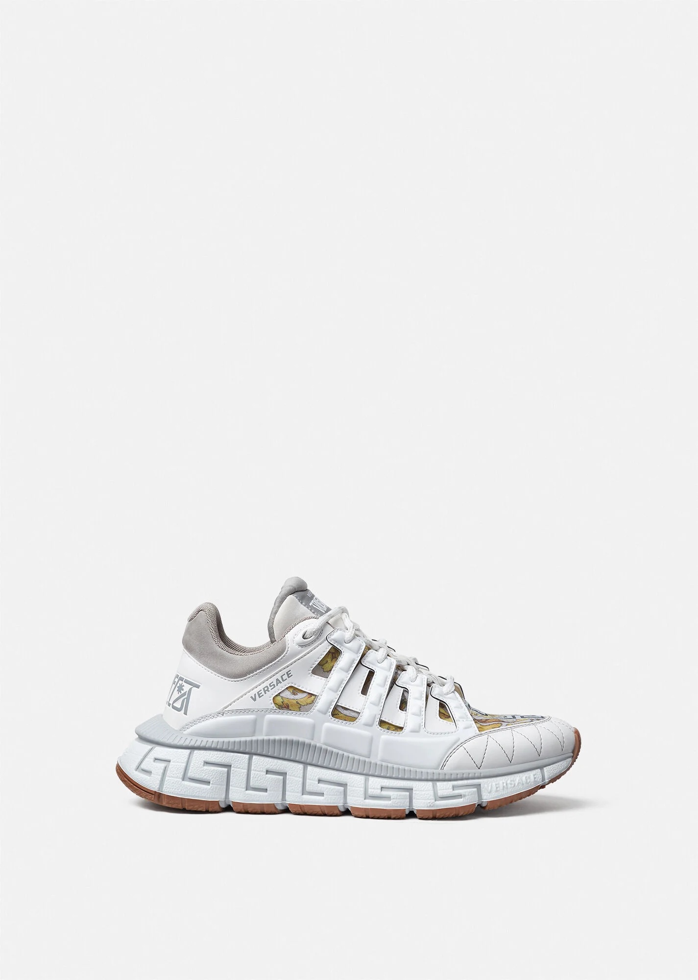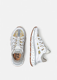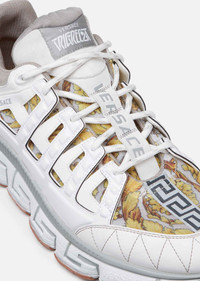 The latest addition to Versace's coveted sneaker family, the Trigreca bring innovation to the brand's ever-evolving aesthetic. Referencing Versace DNA, the Trigreca feature the Barocco print and three prominent Greca executions: the midsole lateral, medial, and the bottom of the outsole. This combination creates the "Greca Cushioning System". In a subtle nod to Milan, the upper has a discrete print of the city's coordinates. DETAILS & CARE - Low top - Lace up - Barocco print - Trigreca print on the tongue and heel - Printed coordinates of Milan - Midsole lateral Greca - Midsole Medial Greca - Greca on the bottom of the TPU outsole - Top-stitching - Outer fabric: 100% Nylon - Insole: 100% Polyester - Sole: 100% Rubber - Trim: 100% Leather - Made in Italy SIZE & FIT - Height: 4 - All sizes fit Italian standards - Fits true to size, take your normal size