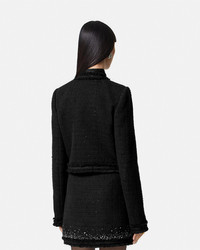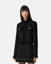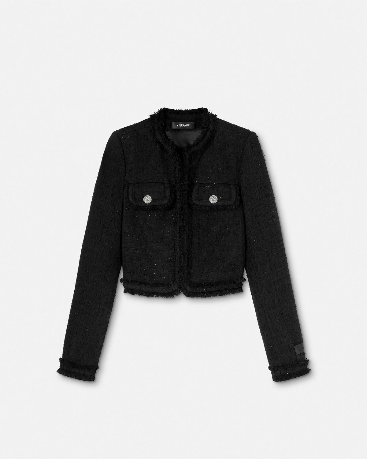 DETAILS A cotton-blend tweed collarless open jacket with accent Medusa hardware and frayed trims. - Medusa hardware - Tailoring label - Long sleeves - Chest flap pockets - Concealed hook-and-eye closure - Outer composition: 80% Cotton, 15% Nylon, 5% Viscose - Lining: 58% Cupro, 42% Viscose Item: 1014378-1A09573_1B000 SIZE & FIT - The model is 5'10" tall and wears size 38 IT