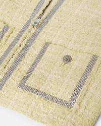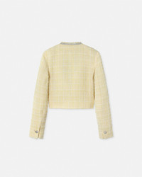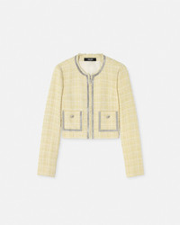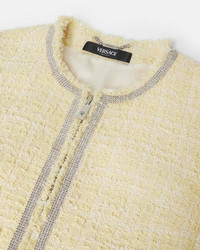 DETAILS A collarless cardigan jacket in a blend cotton tweed featuring crystalembellished trims jewellike Medusa buttons and frayed edges The style is fully lined in twill - Medusa hardware - Crystal embellishments - Long sleeves - Round neckline - Front zip closure - Front patch pockets - Buttoned cuffs - Outer composition: 70% Cotton, 15% Nylon, 13% Viscose, 2% Linen - Lining: 100% Cupro - Trim 1: 74% Acetate, 26% Viscose - Trim 2: 100% Metal Item: 1020110-1A15389_1YD20