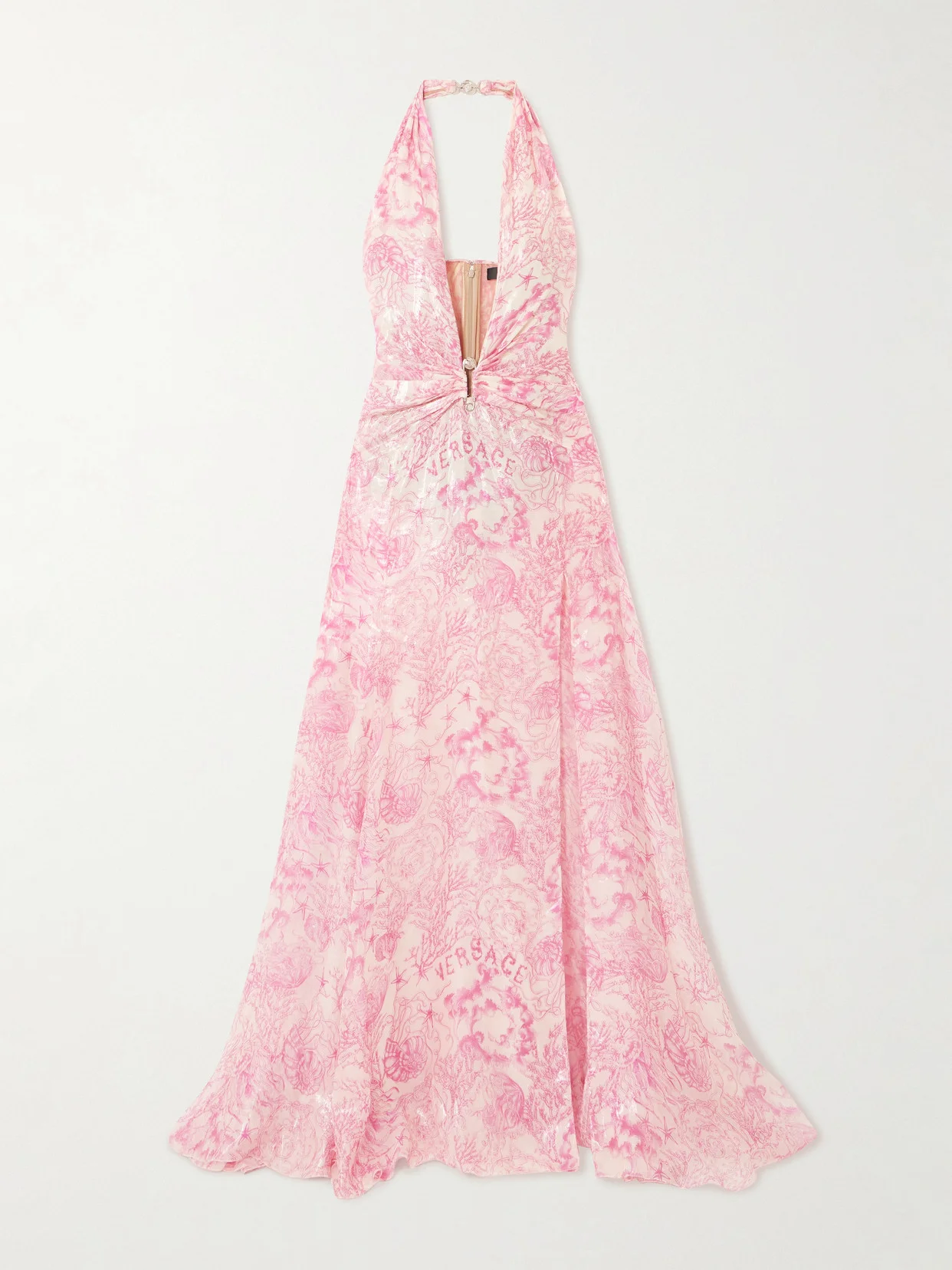 Inspired by underwater scenes, Versace's gown showcases one of the prettiest takes we've seen of the label's iconic barocco motif. It's made from silk-blend that glistens with metallic yarn through the featherweight chiffon. A branded silver-tone pin decorates the plunging bodice, which is boned to enhance your natural shape.
