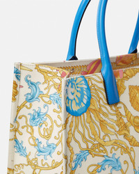 Crafted from canvas with leather top handles, this spacious tote bag features an Underwater Barocco print and is detailed with a front La Medusa hardware. It showcases a leather raised Versace Logo lettering, two zipped pockets, and a leather protector strap. The front D-ring provides an optional attachment for a keychain or charm. - Underwater Barocco print - La Medusa hardware - Versace Logo lettering - Double top handles - Two internal zipped pockets - Leather feet - Outer composition: 100% Cotton - Lining: 100% Cotton - Trim: 100% Calf leather Size & Fit - L15.7 x W6.3 x H11.8" / L40 x W16 x H30 cm - Handle drop: L6.3" / L16 cm - Approximate weight: 38.8 oz / 1.1 kg Item: 1004741-1A15308_DTU_UNICA_5K75P__