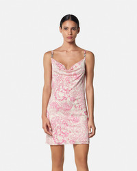 DETAILS A slip mini dress with a draped cowl neckline in liquid jersey featuring accent Medusa 95 hardware on the shoulder straps and an Underwater Barocco Allover print with seashell coral and starfish motifs - Underwater Barocco Allover print - Medusa '95 hardware - Sleeveless - Shoulder straps - Cowl neckline - Slip on - Outer composition: 100% Viscose - Lining: 100% Viscose Item: 1021021-1A15223_5K660 SIZE & FIT - The model is 5'10" / 1.79 m tall and wears size 38 IT