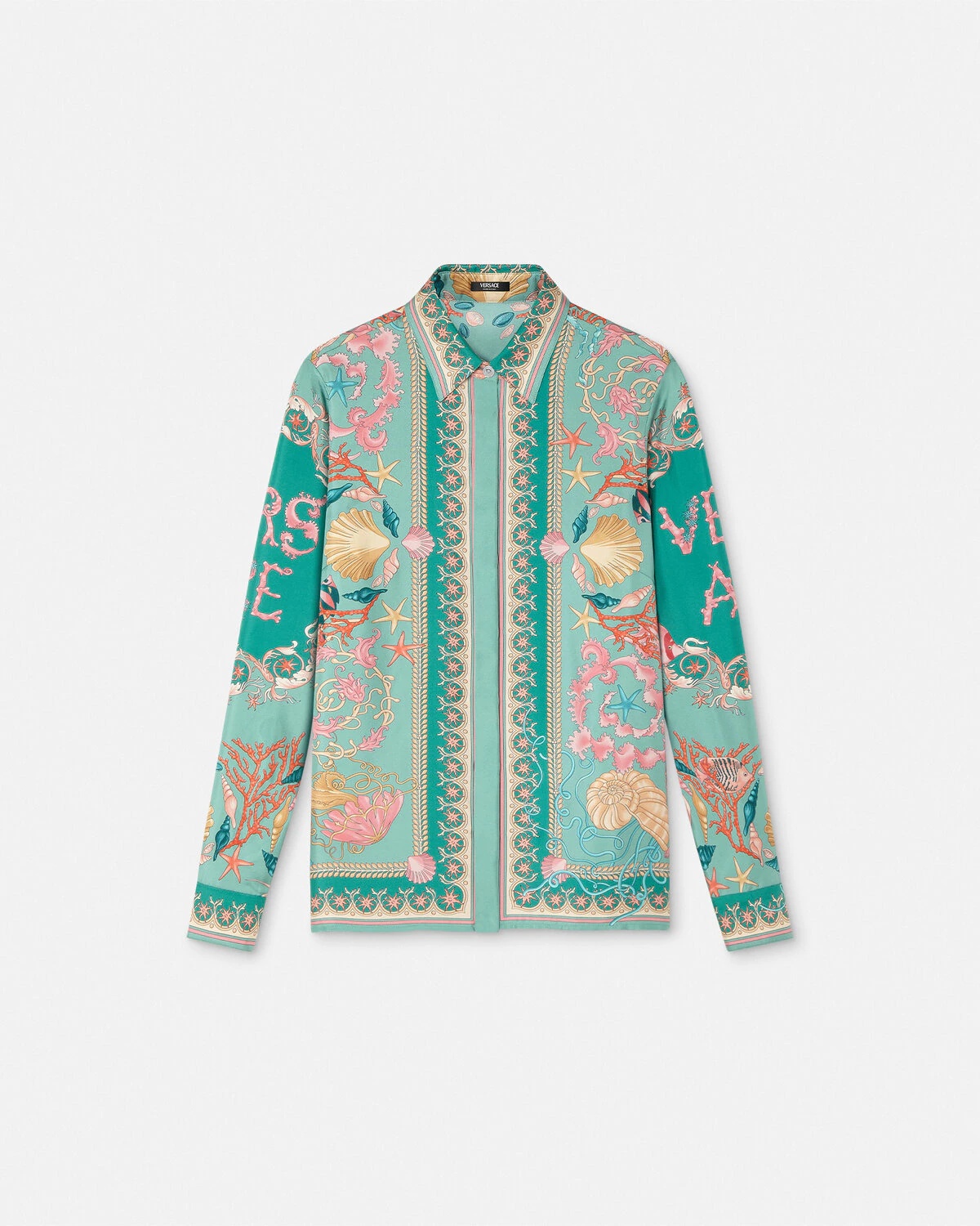 DETAILS This classic longsleeved shirt is made from silk twill and features an Underwater Barocco print with a single accent Medusa button at the front closure - Underwater Barocco print - Medusa hardware - Long sleeves - Pointed collar - Concealed front button closure - Buttoned cuffs - Outer composition: 100% Silk Item: 1001360-1A14746_5GA30 SIZE & FIT - The model is 5'10" / 1.79 m tall and wears size 38 IT