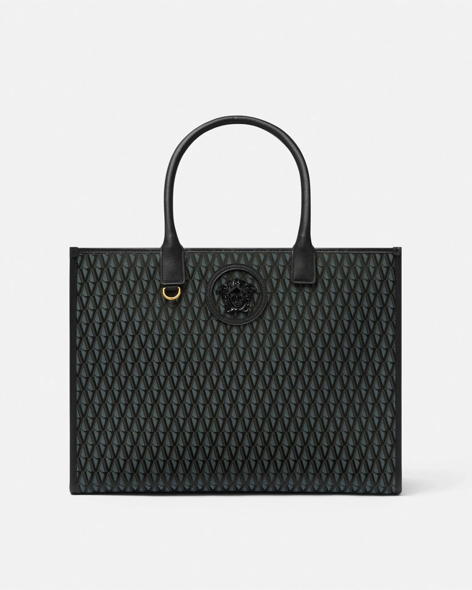 Crafted from canvas with leather top handles, this spacious tote bag features an all-over jacquard V-shaped motif and is detailed with a front three-dimensional La Medusa hardware. It is complete with two interior zipped pockets and a leather protector strap. The front D-ring provides an optional attachment for keychain or charm. - V Allover motif - La Medusa hardware - Double top handles - Two internal zip pockets - Leather feet - Outer Composition: 61% Polyester, 39% Cotton - Lining: 100% Cotton - Trim: 100% Calf Leather Size & Fit - L15.7 x W6.3 x H11.8" / L40 x W16 x H30 cm - Handle drop: L6.3" / L16 cm - Approximate weight: 38.8 oz / 1.1 kg Item: 1004741-1A16242_DTU_UNICA_1B09V__