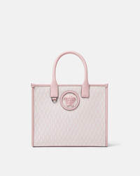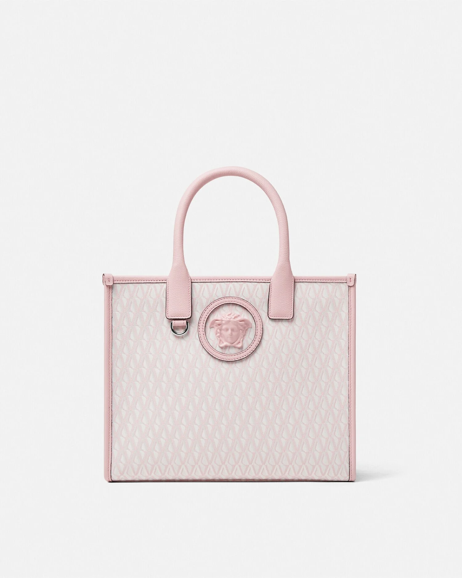 Crafted from canvas with leather top handles, this tote bag features an all-over jacquard V-shaped motif and is detailed with a front three-dimensional La Medusa hardware. It is complete with two zipped pockets and a leather protector strap. The style can be worn in-hand or on the shoulder for added versatility. The front D-ring provides an optional attachment for a keychain or charm. - V Allover motif - La Medusa hardware - Double top handles - Two internal zipped pockets - Detachable and adjustable shoulder strap - Leather feet - Outer Composition: 61% Polyester, 39% Cotton - Lining: 100% Cotton - Trim: 100% Calf Leather Size & Fit - L11.6 x W5.7 x H9.4" / L29.5 x W14.5 x H24 cm - Handle drop: L5.1" / L13 cm - Shoulder strap: L33.1-40.9" / L84-104 cm - Shoulder strap drop: L14.8-22.6" / L37.5-57.5 cm - Approximate weight: 28.2 oz / 0.8 kg Item: 1005861-1A16242_DTU_UNICA_1P48P__