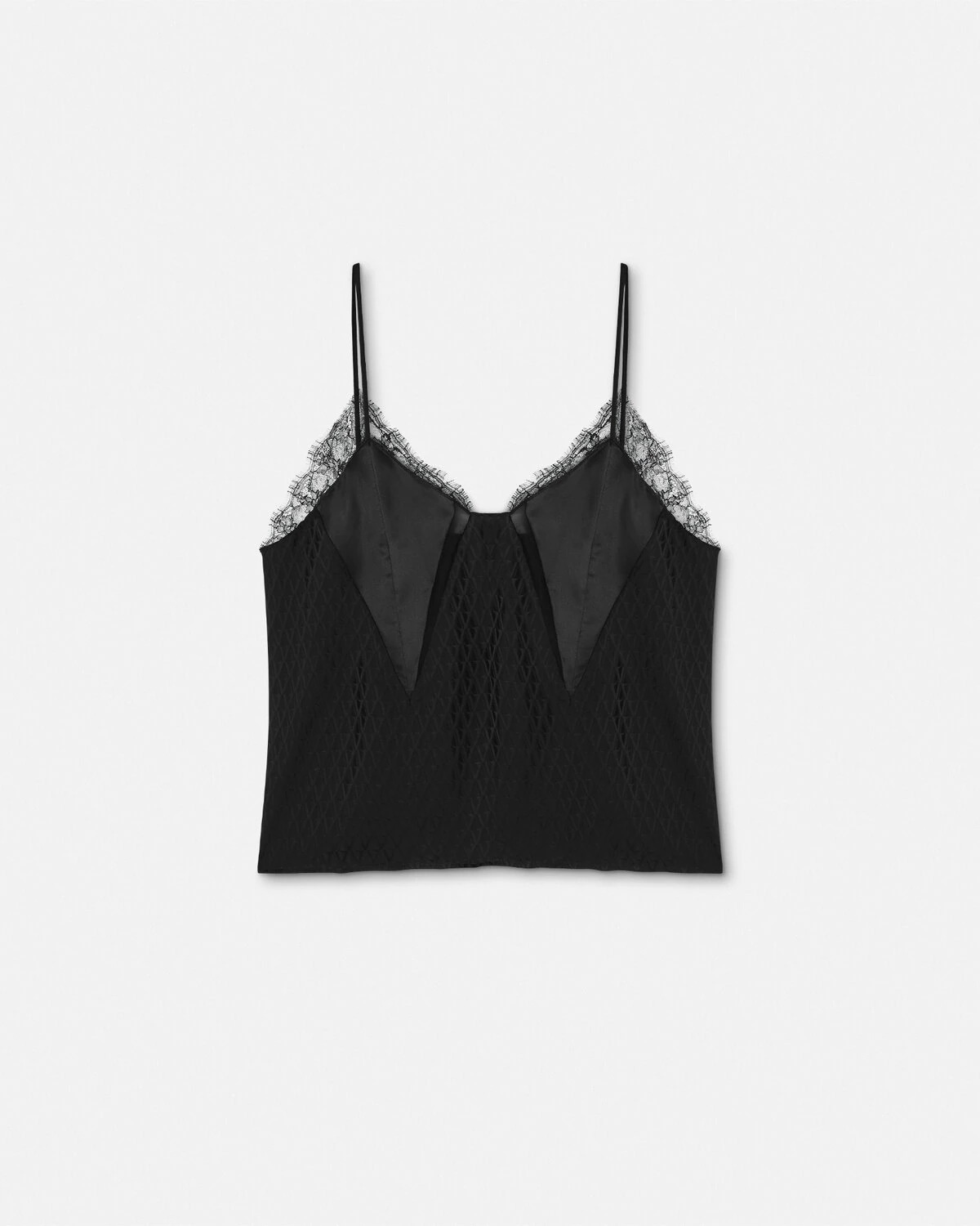 DETAILS This slip camisole top in silk satin features a tonal V Allover pattern with Vshaped panels and mesh inserts - V Allover print - Adjustable shoulder straps - V-neckline - Outer Composition 1: 60% Viscose, 40% Silk - Outer Composition 2: 100% Silk - Trim: 51% Viscose, 49% Polyamide Item: 1022143-1A16540_1B000