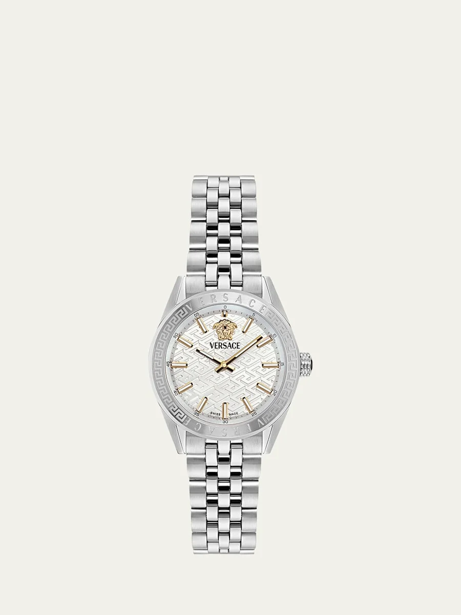 Versace chronograph watch with signature Greca detailing Approx. 36mm round stainless steel case Silver dial with gold-tone baton indices Medusa logo at 12 o'clock Stainless steel five-link bracelet strap Deployant buckle Quartz movement Spot clean Made in Switzerland Online Inquiries: BGS21_Y7HXL| Store Inquiries: #5019539