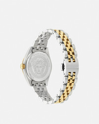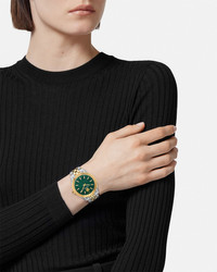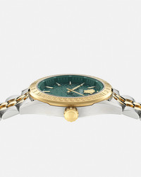 DETAILS A sleek timeless piece enriched with the Greca 3D pattern at the dial and an embellished top ring featuring Greca and Versace logo engravings throughout. All Versace watches are guaranteed by the 'Swiss Made' marking. - Case: Bicolor (SS&IP2N) case with Greca and Versace logo engraving on top ring - Dial: Green dial with Greca 3D pattern / Versace logo and Medusa at 12h - Bracelet: Bicolor (SS&IP2N) bracelet with butterfly buckle - Movement: RONDA 762 Swiss Quartz 2-hands movement - Water Resistant: 5 ATM Item: PVE8I004-P0024_RTU_TU_PNUL__ SIZE & FIT - Case: 1.4"