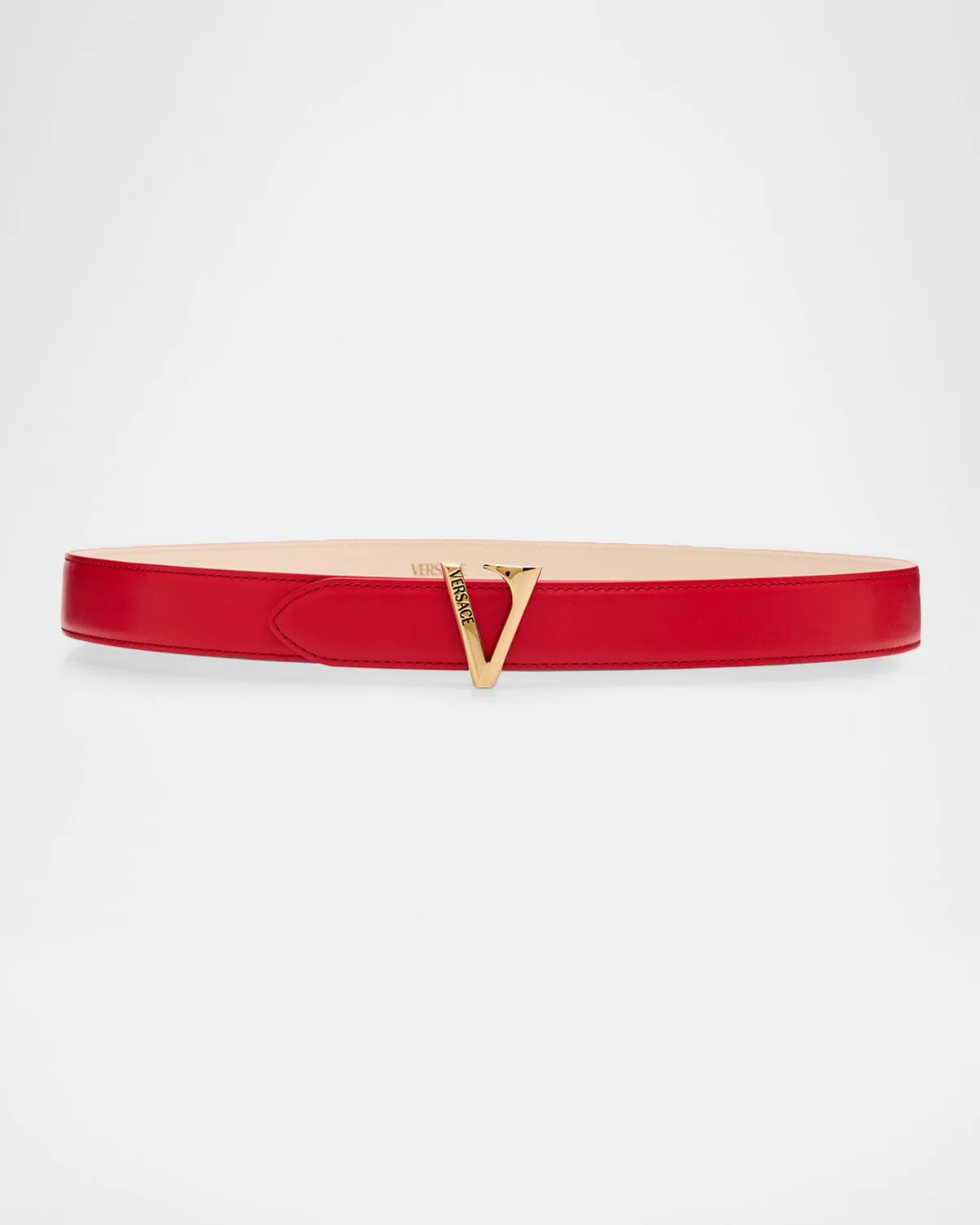 Versace calf leather belt accentuated by sliding V hardware engraved with the house's logo. Approx. 1.2"H Pin buckle closure Leather Made in Italy
