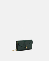 This long wallet on chain is crafted from smooth calf leather and features a distinctive V hardware with an engraved enamel Versace Logo at the front closure. The accessory comes with a detachable chain strap for optional crossbody wear. - V hardware - Foldover flap with magnetic closure - 2 note compartments - 6 card slots - Internal zipped pocket - Outer Composition: 100% Calf Leather - Lining: 60% Cotton, 40% Viscose Size & Fit - L11.4 x W1.4 x H3.7" / L29 x W3.5 x H9.5 cm - Chain strap drop: 21.7" / 55 cm - Approximate weight: 10.6 oz / 0.3 kg Item: 1021374-1A13677_DTU_UNICA_1GJ1V__