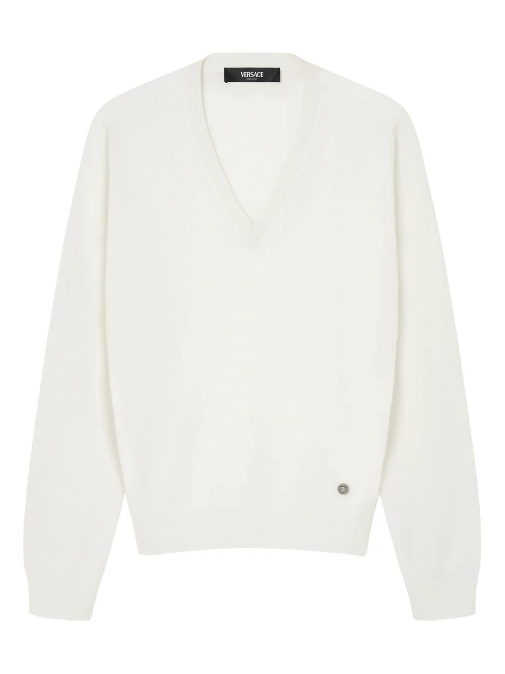 V-neck sweater Highlights - White - V-neck - Logo detail - Long sleeves - Ribbed hem and cuffs Made in Italy Composition Fabric 100% Washing instructions Read Manufacturer Guidelines