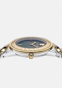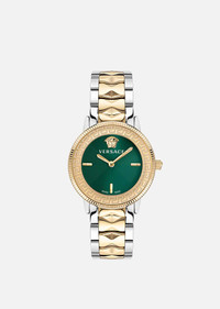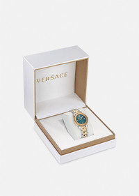 A contemporary timepiece combining geometric shapes and feminine style, this V-Tribute watch features champagne case embossed with a Greca motif and green dial. Instantly recognizable by the Medusa plaque at the 12 o’clock position while the champagne and silver-tone band complete the look. DETAILS & CARE - Case: Bico (SS&IP Champagne) round case with tonal Greca motif on the top ring - Dial: Green dial with Versace logo and Medusa head at 12h - Bracelet: Bico (SS&IP Champagne) band with buckle with pusher - Movement: RONDA 762.3 Swiss quartz 2 hands movement - Water Resistant: 5 ATM