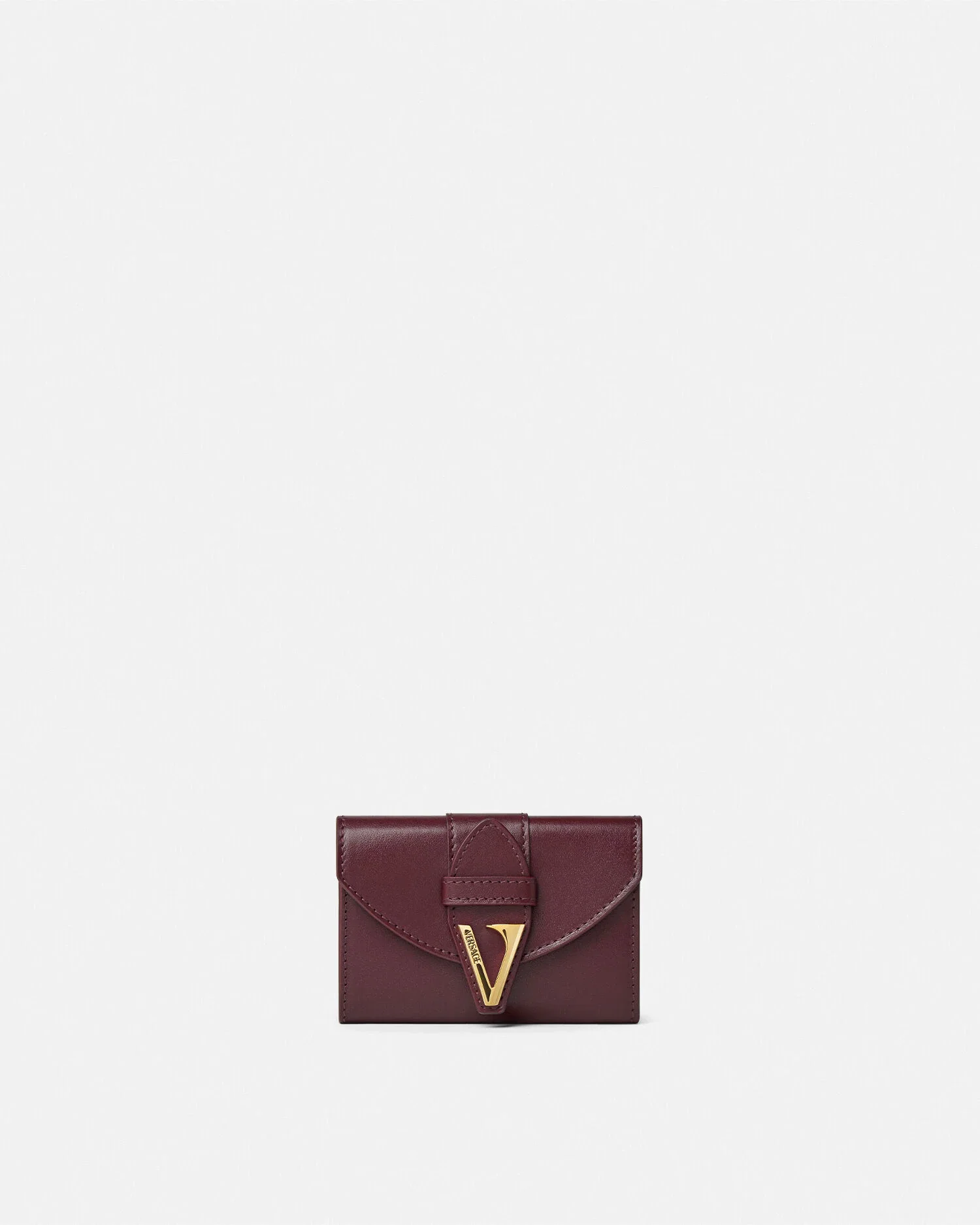 A compact bifold wallet in smooth calf leather accented by a distinctive V hardware with an engraved enamel Versace Logo at the front snap-buttoned closure. The accessory is completed by an interior compartment and a back slip pocket. - V hardware - Bifold design - Snap-button closure - Interior compartment - Interior slip pocket - Back slip pocket - Outer Composition: 100% Calf Leather Size & Fit - L4.3 x W1 x H3" / L11 x W2.5 x H7.5 cm - Approximate weight: 3.5 oz / 0.1 kg Item: 1022103-1A13677_DTU_UNICA_1R70V__