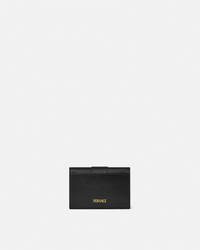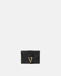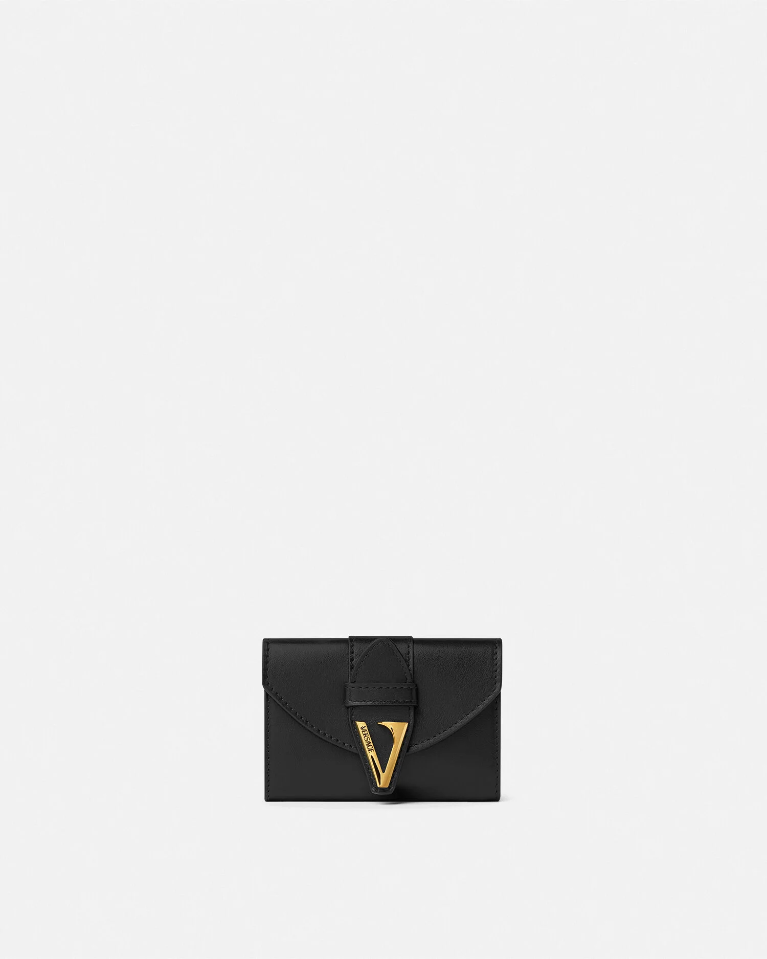 A compact bifold wallet in smooth calf leather accented by a distinctive V hardware with an engraved enamel Versace Logo at the front snap-buttoned closure. The accessory is completed by an interior compartment and a back slip pocket. - V hardware - Bifold design - Snap-button closure - Interior compartment - Interior slip pocket - Back slip pocket - Outer Composition: 100% Calf Leather Size & Fit - L4.3 x W1 x H3" / L11 x W2.5 x H7.5 cm - Approximate weight: 3.5 oz / 0.1 kg Item: 1022103-1A13677_DTU_UNICA_1B00V__