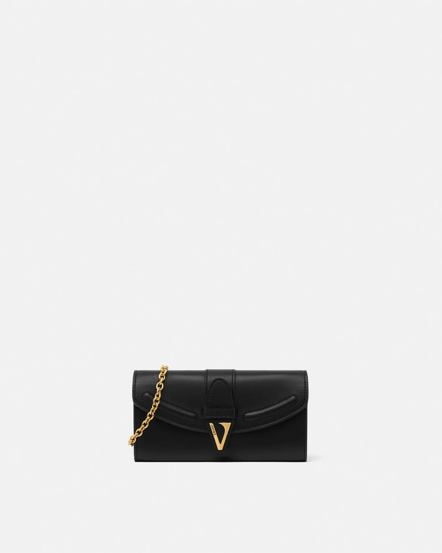This long wallet on chain is crafted from smooth calf leather and features a distinctive V hardware with an engraved enamel Versace Logo at the front closure. The accessory comes with a detachable chain strap for optional crossbody wear. - V hardware - Foldover flap with magnetic closure - 2 note compartments - 6 card slots - Internal zipped pocket - Outer Composition: 100% Calf Leather - Lining: 60% Cotton, 40% Viscose Size & Fit - L11.4 x W1.4 x H3.7" / L29 x W3.5 x H9.5 cm - Chain strap drop: 21.7" / 55 cm - Approximate weight: 10.6 oz / 0.3 kg Item: 1021374-1A13677_DTU_UNICA_1B00V__