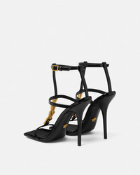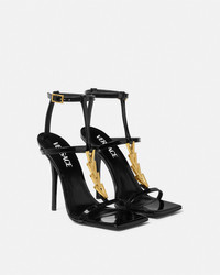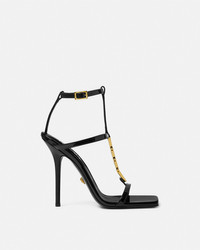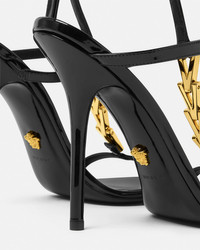 DETAILS These evening stilettoheel sandals with a squared toe are crafted from patent leather and are accented by a distinctive Vshaped hardware at the front strap - V hardware - Versace Logo engraving - Square toe - Stiletto heels - Adjustable ankle buckle strap - Outer composition: 100% Calf leather - Lining: 100% Lambskin - Sole: 100% Calf leather Item: 1018236-D2VE_1B00V SIZE & FIT - The shoe weighs approximately 7.1 oz / 0.2 kg for the model size 39 IT - Heel: 4.1" / 10.5 cm - Footbed: regular - Fits true to size, take your normal size