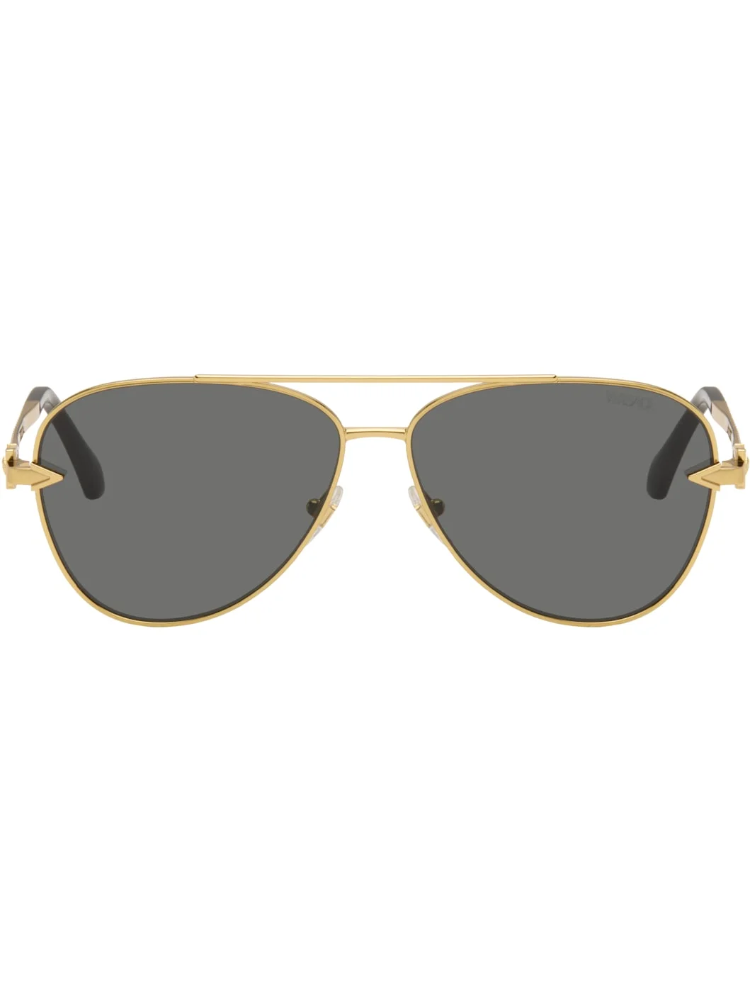 Aviator-style metal-frame sunglasses. · Gray lenses · Logo etched at lens · 100% UVA/UVB protection, category 3 · Double bridge · Adjustable rubber nose pads · Logo hardware at face and temples · Graphic engraved at temples · Black acetate trim at temple tips · Includes case · Size: 61.13 140 Supplier color: Gold Metal, acetate. Made in Italy 252404F005019