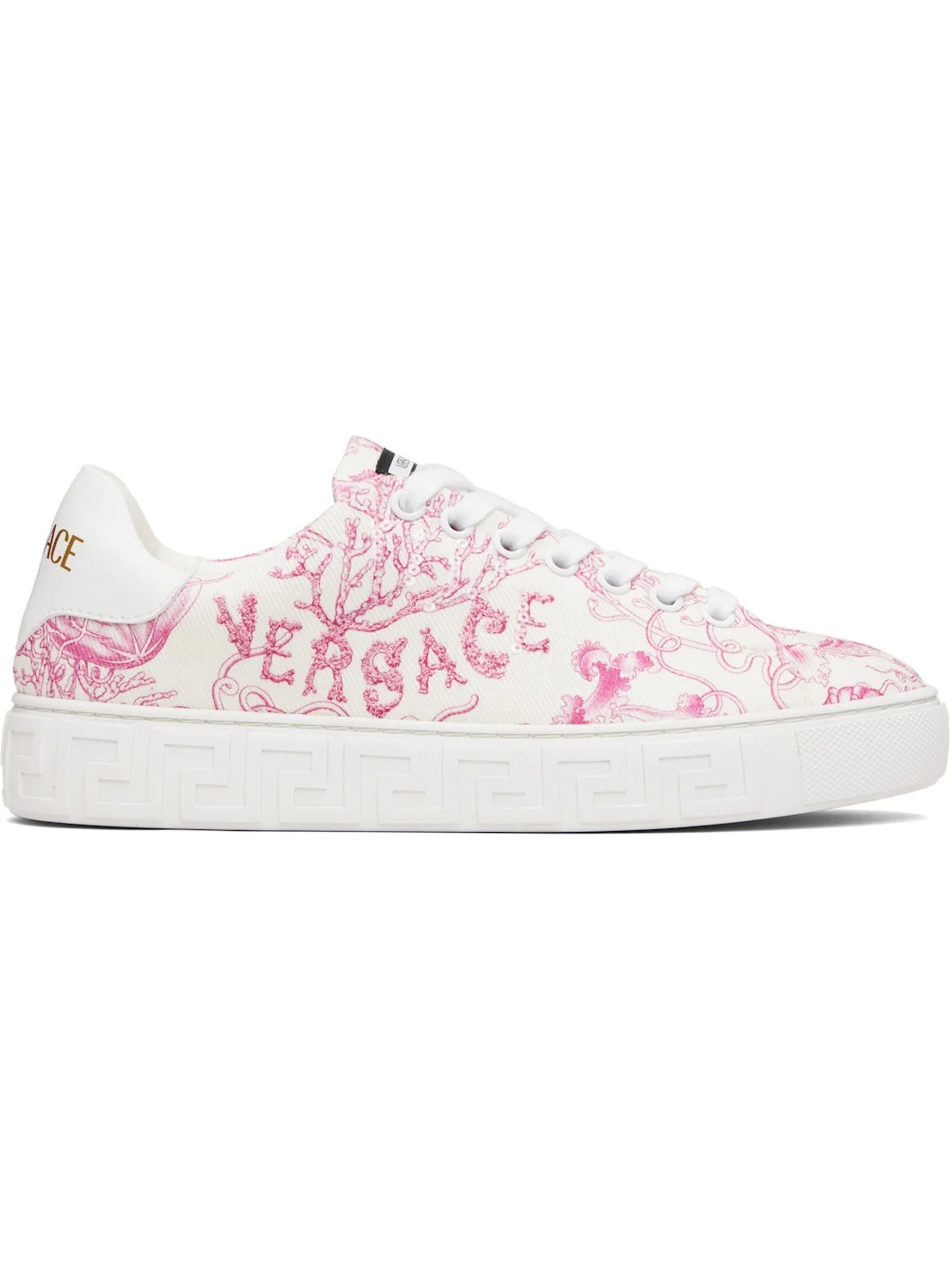 Low-top cotton twill sneakers. · Graphic pattern printed throughout · Lace-up closure · Logo patch at tongue · Padded tongue and collar · Logo embroidered and sequinned at outer side · Logo printed at faux-leather heel tab · Greek key-embossed midsole · Treaded rubber sole Part of the La Vacanza collection. Supplier color: Pink/White Upper: textile, synthetic. Sole: rubber. Made in Italy 252404F128002