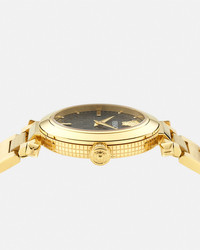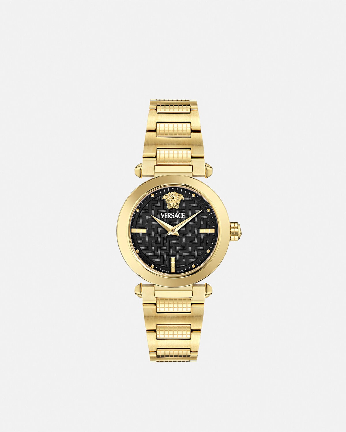 DETAILS The Versace Greek watch pays homage to Versaces signature motifs with a matelass effect on the dial and the Houses Medusa and Versace Logo at 12 oclock The Greca motif on the inner dial completes the elegant and refined design All Versace watches are guaranteed by the Swiss Made marking All stainless steel is recycled - Case: IP2N case - Dial: Black guilloche dial with Greca pattern / Medusa and Versace Logo at 12h - Bracelet: IP2N bracelet with butterfly buckle - Movement: RONDA VE762E/3 Swiss Quartz 2 hands movement - Water Resistant: 5 ATM Item: PVE5B006-P0025_PNUL SIZE & FIT - Case: 1.4" / 35 mm