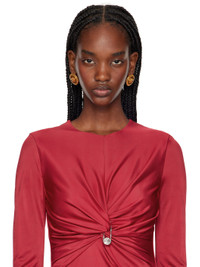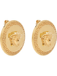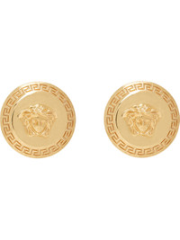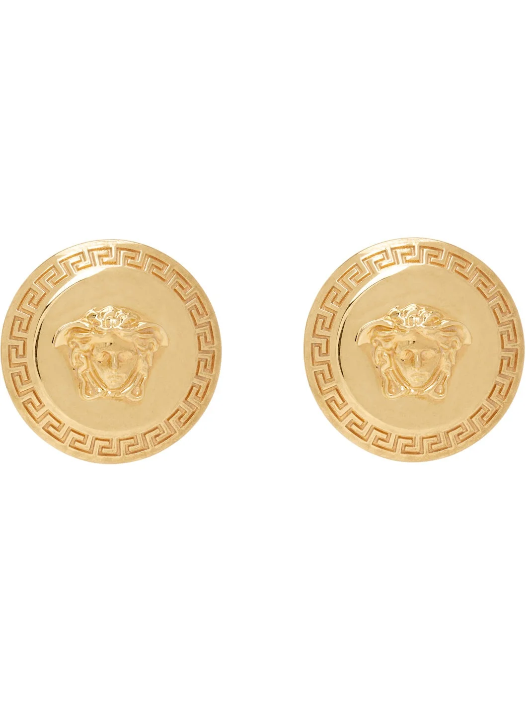 Pair of stud earrings in antiqued gold-tone brass. - Signature Medusa and Greek key pattern at face - Post-stud fastening - D1.25 Supplier color: Light gold