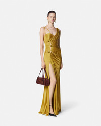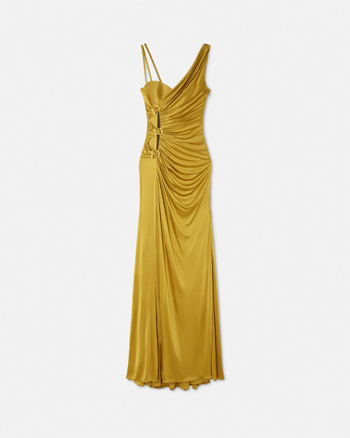 DETAILS An elegant asymmetric gown in liquid jersey with a deep side slit featuring mesh cutouts and the Houses signature Heritage buckles gathered at the side - Heritage buckle hardware - Sleeveless - Padded cups - Concealed side zip closure - Outer composition: 100% Viscose - Inner composition: 84% Nylon, 16% Elastane - Lining 1: 75% Acetate, 25% Silk - Lining 2: 100% Viscose Item: 1020422-1A12497_1YD10 SIZE & FIT - The model is 5'11" / 1.80 m tall and wears size 38 IT