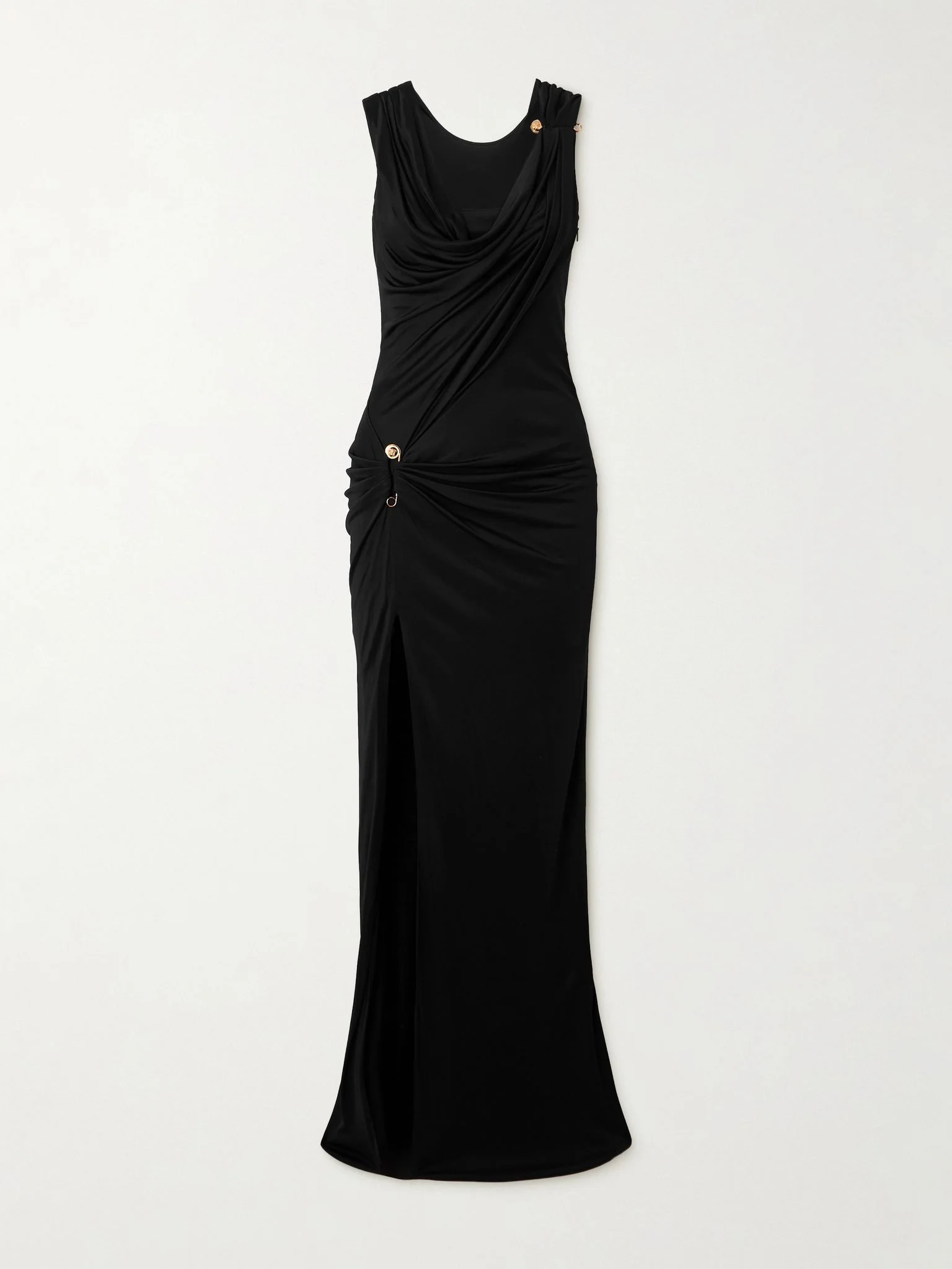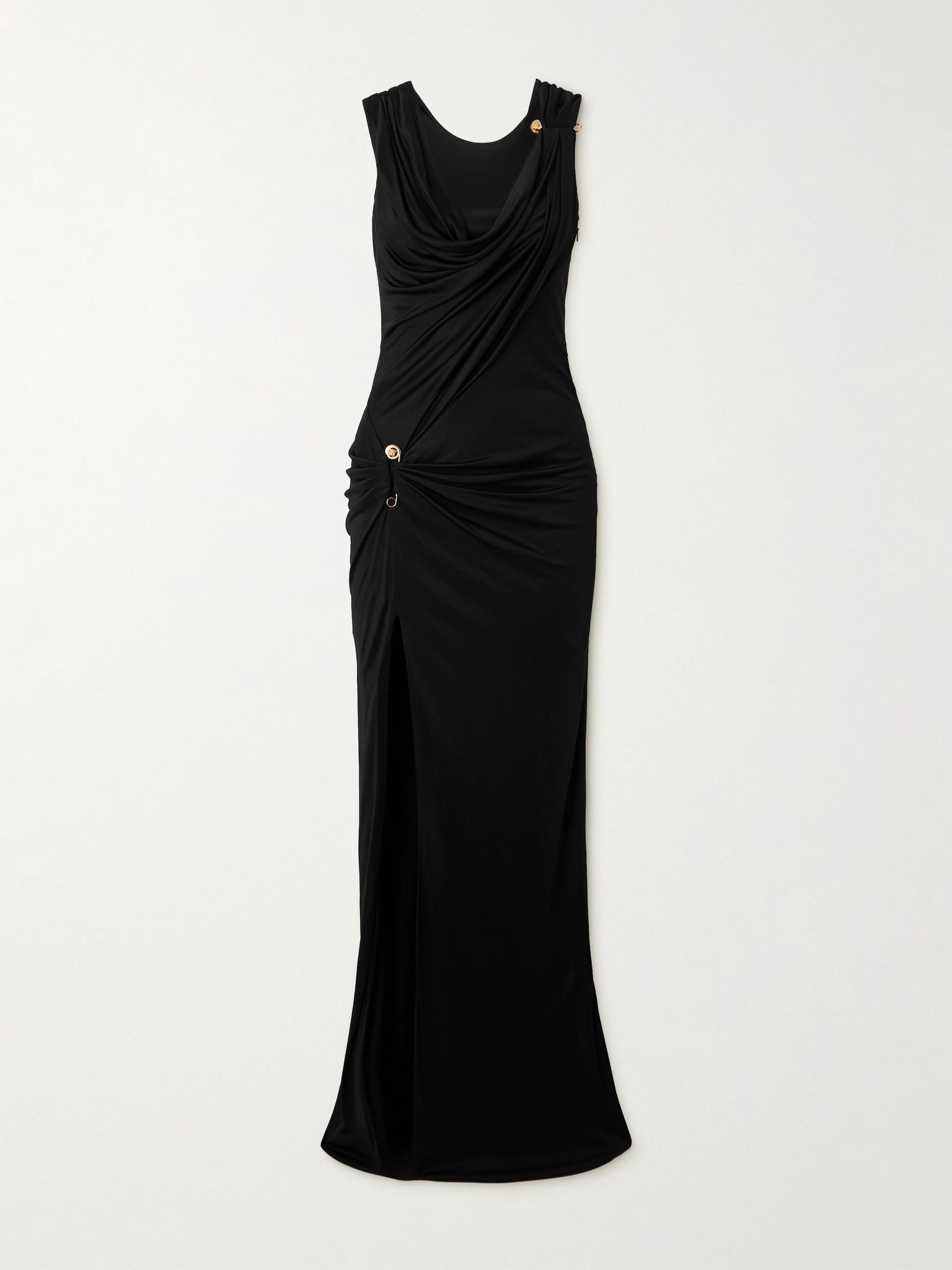 Versace's glamorous gown is sure to leave a lasting impression. It's made from black stretch-jersey that's beautifully draped through the neck and waist and adorned with the signature 'Medusa' hardware. Style yours with metallic accessories. Size & Fit - Fits true to size, take your normal size - Designed for a close fit - Lightweight, stretchy fabric - Model is 177cm/ 5'10" and is wearing an IT 38 Model measurements: - Bust: 80cm/ 31.5" - Waist: 60cm/ 23.5" - Hip: 89cm/ 35" Details & Care - Black stretch-jersey - Concealed hook and zip fastening at side - 100% viscose - Dry clean