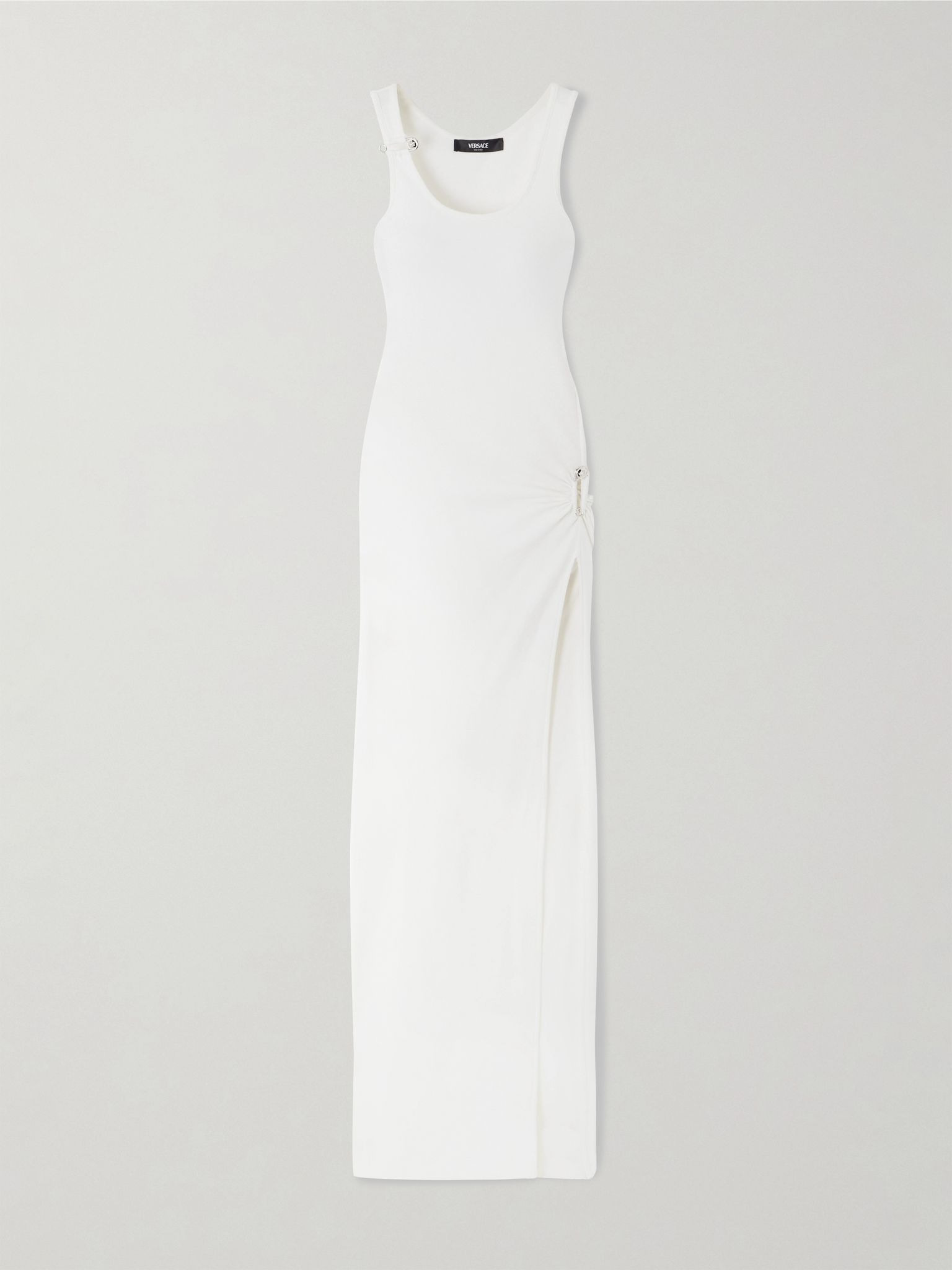 Versace's dress has subtle cutouts embellished with the signature 'Medusa' engraved safety pins. It's cut from ribbed cotton-blend jersey for a figure-hugging fit and has a generous front split. Size & Fit - Fits true to size, take your normal size - Designed for a slim fit - Mid-weight, non-stretchy fabric - Model is 177cm/ 5'10" and is wearing an IT 40 Model measurements: - Bust: 86cm/ 34" - Waist: 65cm/ 25.5" - Hip: 90cm/ 35.5" Details & Care - White cotton-blend jersey - Slips on - 95% cotton, 5% elastane - Dry clean