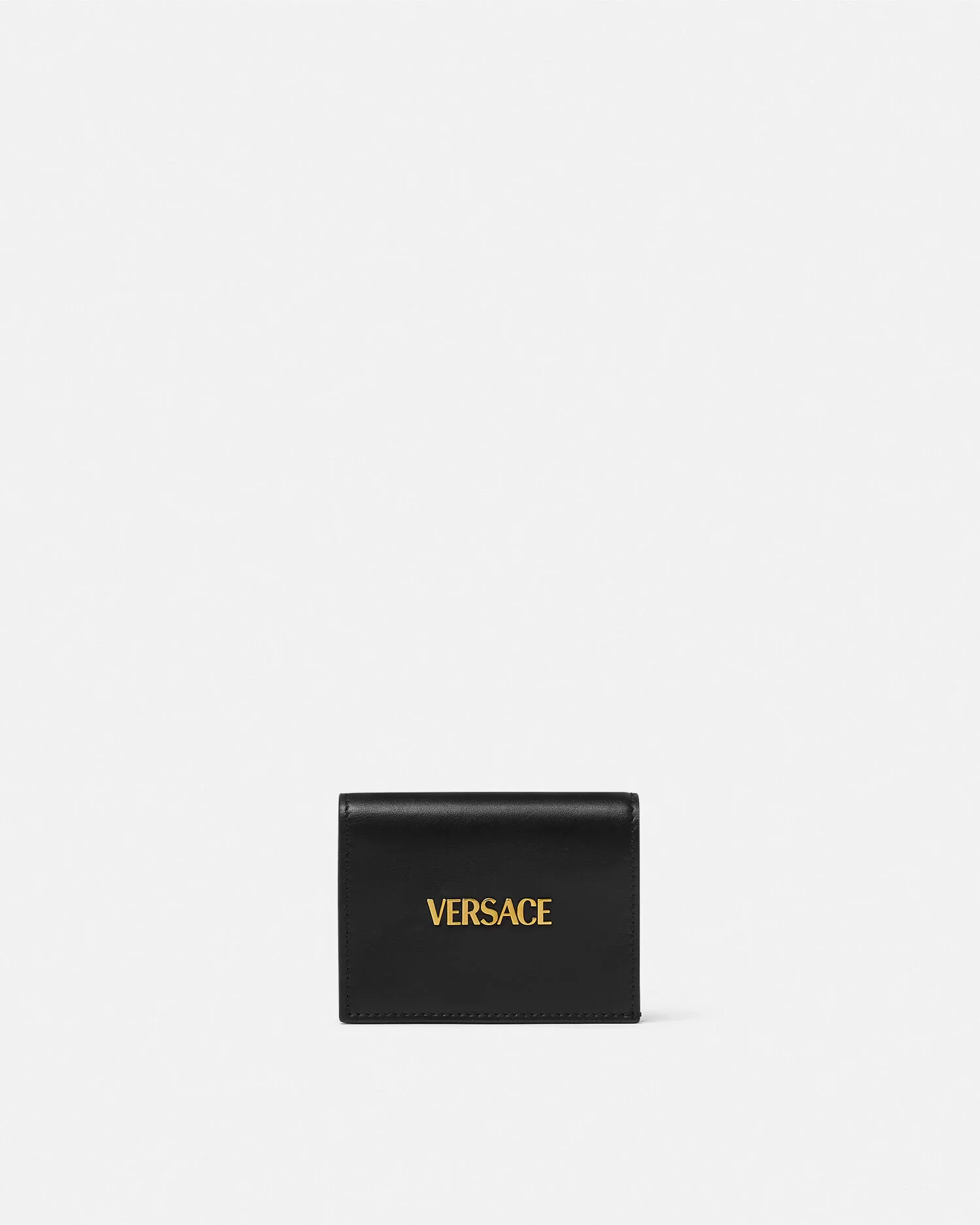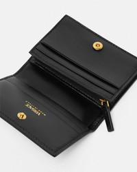 A compact bifold wallet in a smooth calf leather featuring a metal Versace Logo lettering, multiple interior card slots, a zipped coin pouch and a note compartment. - Versace Logo lettering - Bifold design - Snap-button closure - 5 card slots - Zipped coin compartment - Note compartment - Slip pocket - Back slip pocket - Outer composition: 100% Calf leather - Lining: 60% Cotton, 40% Viscose - Trim: 100% Lambskin Size & Fit - L4.3 x W1.2 x H3.1" / L11 x W3 x H8 cm - Approximate weight: 3.5 oz / 0.1 kg Item: 1020080-1A13677_DTU_UNICA_1B00V__