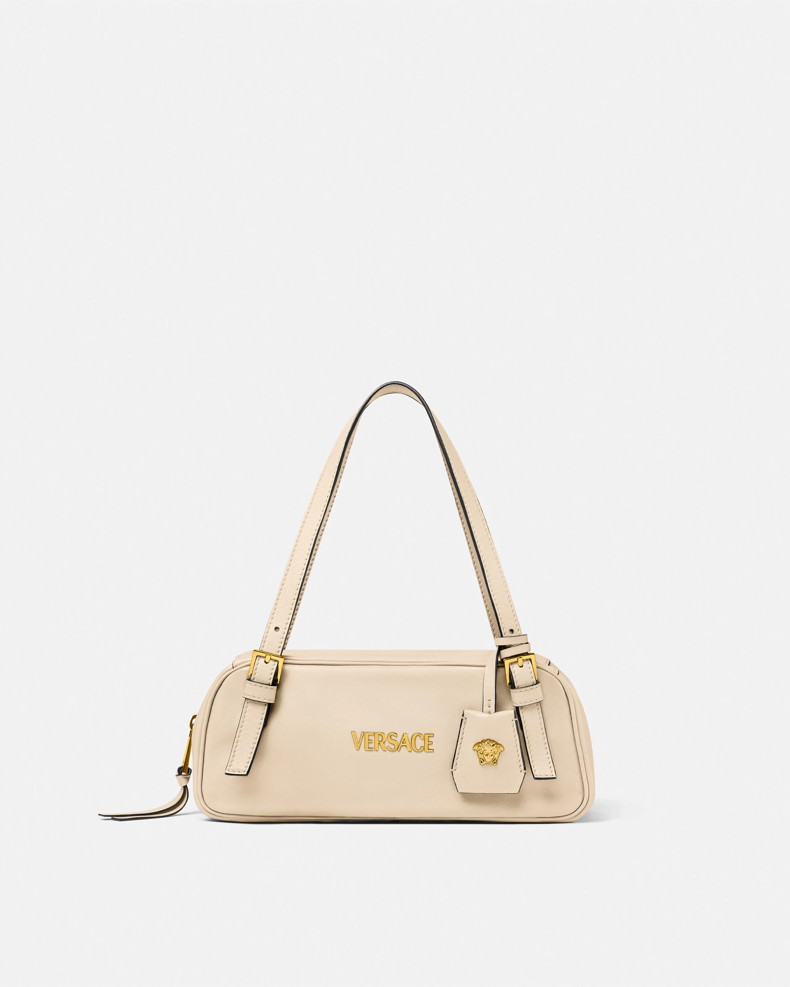 The Versace Tag bowling shoulder bag is crafted from ultra-soft nappa leather. The versatile accessory is accented by metal Versace lettering and can easily be carried over the shoulder or in-hand by the adjustable leather handles. A removable leather tag keychain with Medusa hardware completes the design. - Medusa hardware - Versace Logo lettering - Top zip closure - Adjustable top handles - Interior slip pocket - Removable keychain tag - Outer composition: 100% Lambskin - Lining: 100% Polyester Size & Fit - L10.6" x W3.9" x H4.7" / L27 x W10 x H12 cm - Handle drop: 9.8" / 25 cm - Approximate weight: 14 oz / 0.4 kg Item: 1015792-1A13171_DTU_UNICA_1YD7V__