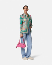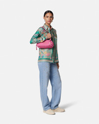 The Versace Tag bowling shoulder bag is crafted from ultra-soft nappa leather. The versatile accessory is accented by metal Versace lettering and can easily be carried over the shoulder or in-hand by the adjustable leather handles. A removable leather tag keychain with Medusa hardware completes the design. - Medusa hardware - Versace Logo lettering - Top zip closure - Adjustable top handles - Interior slip pocket - Removable keychain tag - Outer composition: 100% Lambskin - Lining: 100% Polyester Size & Fit - L10.6" x W3.9" x H4.7" / L27 x W10 x H12 cm - Handle drop: 9.8" / 25 cm - Approximate weight: 14 oz / 0.4 kg Item: 1015792-1A13171_DTU_UNICA_1PV9V__