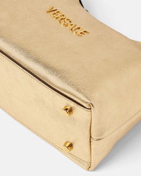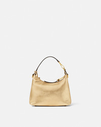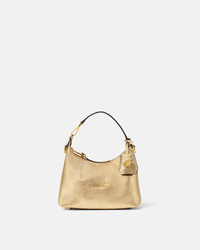 The Versace Tag hobo bag is crafted from metallic laminated nappa leather. The versatile accessory is accented by metal Versace Logo lettering and can easily be carried in-hand by the top handle or crossbody by the detachable and adjustable leather strap. A removable leather tag keychain with Medusa hardware completes the design. - Medusa hardware - Versace Logo lettering - Top zip closure - Top handle - Adjustable and detachable shoulder strap - Removable keychain tag - Outer composition: 100% Lambskin - Lining: 100% Polyester Size & Fit - L9.1 x W6.3 x H4.3" / L23 x W16 x H11 cm - Handle drop: L4.7" / L12 cm - Shoulder strap: L49.2" / L125 cm - Shoulder strap drop: L17.3-19.7-22" / L44-50-56 cm - Approximate weight: 10.6 oz / 0.3 kg Item: 1018302-1A15180_DTU_UNICA_1X23V__