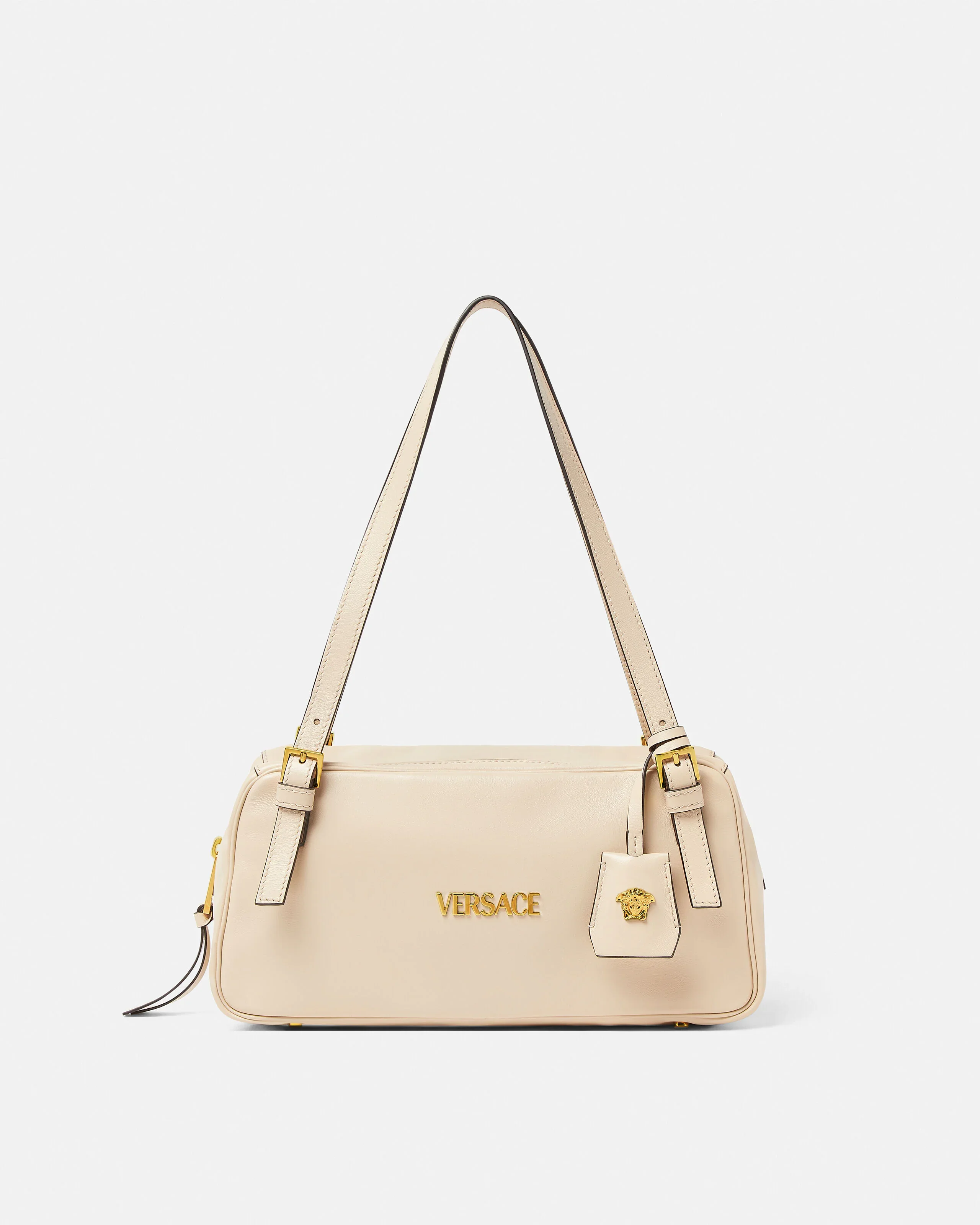The Versace Tag large bowling shoulder bag is crafted from ultra-soft nappa leather. The versatile accessory is accented by metal Versace lettering and can easily be carried over the shoulder or in-hand by the adjustable leather handles. A removable leather tag keychain with Medusa hardware completes the design. - Medusa hardware - Versace Logo lettering - Top zip closure - Adjustable top handles - Interior slip pocket - Removable keychain tag - Outer composition: 100% Lambskin - Lining: 100% Polyester Size & Fit - L11.8 x W4.5 x H5.5" / L30 x W11.5 x H14 cm - Handle drop: L11" / 28 cm Item: 1016428-1A13171_DTU_UNICA_1YD7V__