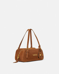 The Versace Tag bowling shoulder bag is crafted entirely from suede. The versatile accessory is accented by metal Versace lettering and can easily be carried over the shoulder or in-hand by the adjustable suede handles. A removable suede tag keychain with Medusa hardware completes the design. - Medusa hardware - Versace Logo lettering - Top zip closure - Adjustable top handles - Interior slip pocket - Removable keychain tag - Outer Composition: 100% Calf Leather - Lining: 100% Polyester Size & Fit - L10.6 x W3.9 x H4.7" / L27 x W10 x H12 cm - Handle drop: 9.8" / 25 cm - Approximate weight: 14.1 oz / 0.4 kg Item: 1015792-1A09892_DTU_UNICA_1NG8V__